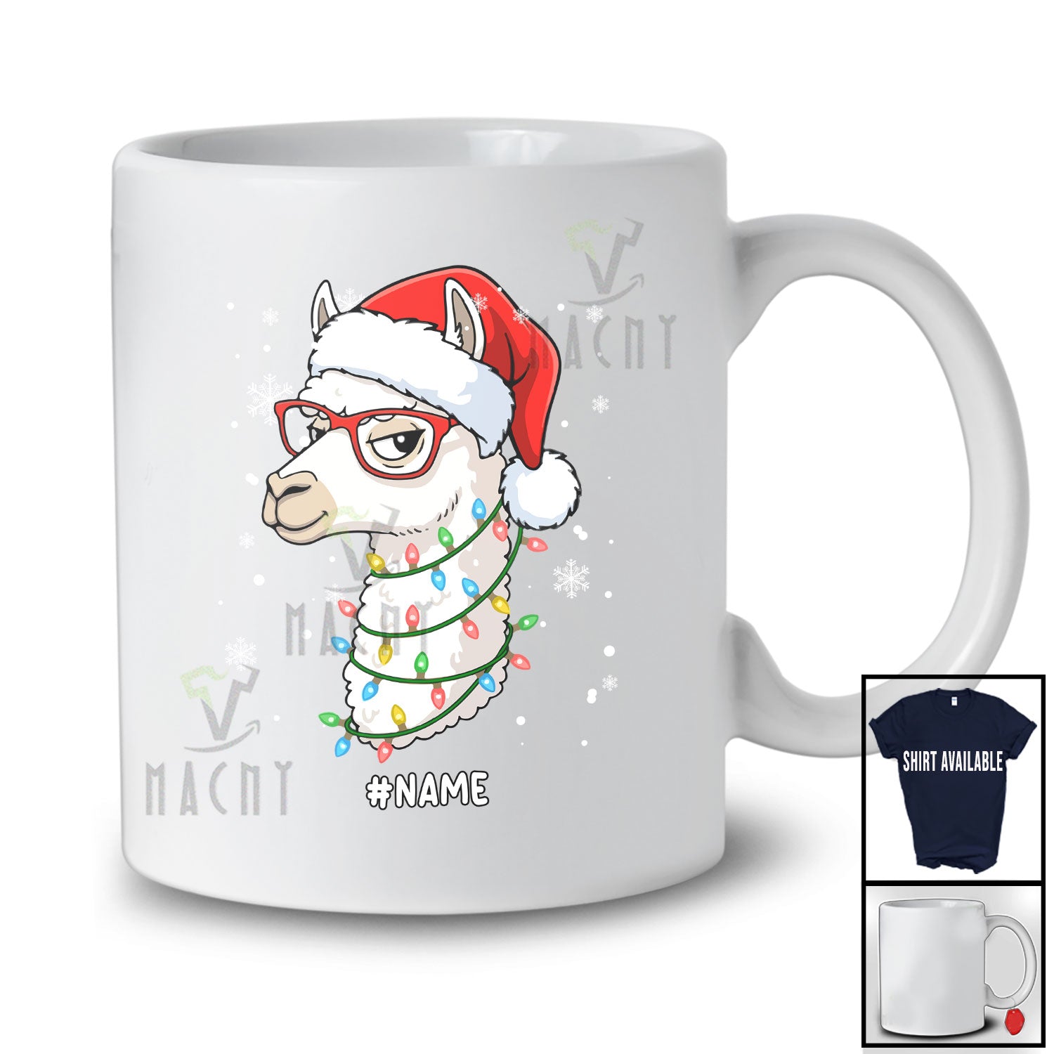 Personalized Custom Name Santa Llama Face Christmas Lights; Merry X-mas Snowing Animal T-Shirt. This cotton t-shirt is a durable staple product with a classic fit. One of the most popular items, it has a relaxed style made for everyday and casual wear.