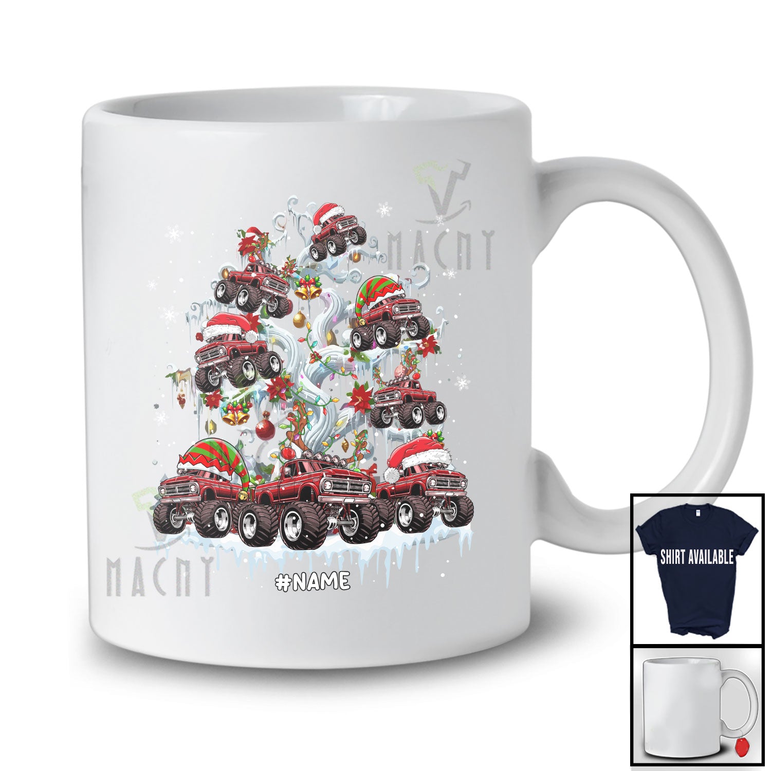 new MacnyStore - Personalized Custom Name Santa Monster Truck On Christmas Tree; Joyful X-mas Snow Lights Driver T-Shirt – Macnystore