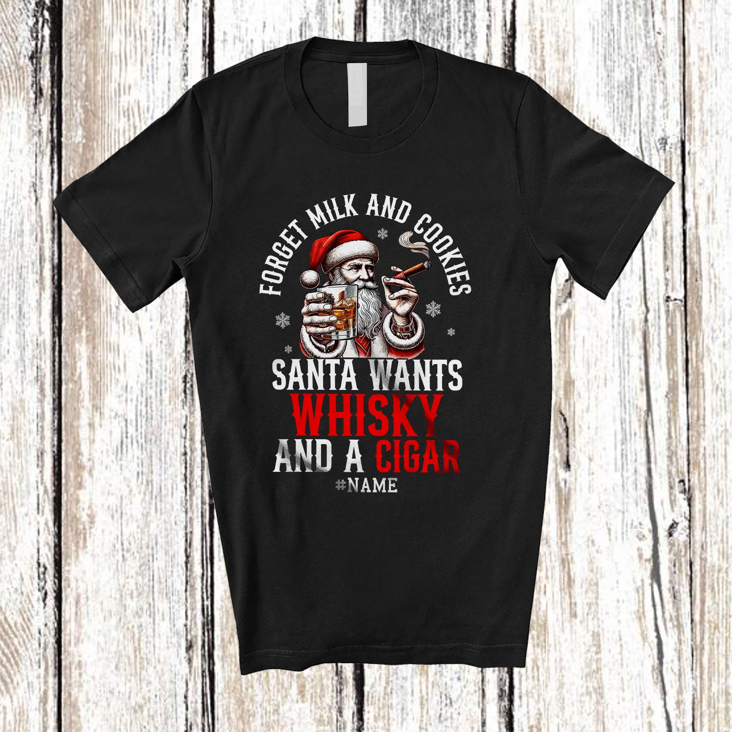 Personalized Custom Name Santa Wants Whisky and Cigar; Joyful Christmas Drinking Smoking T-Shirt