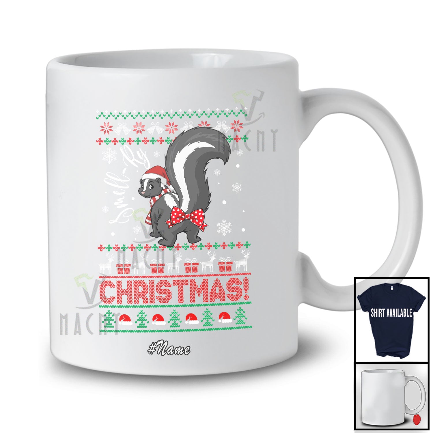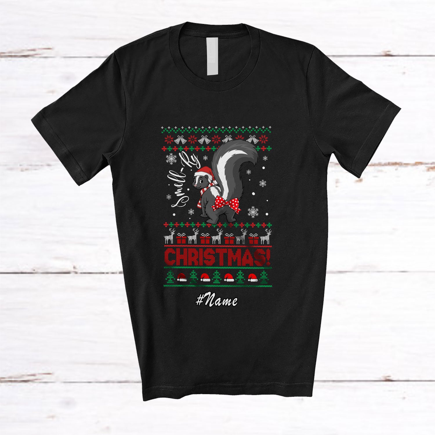 • Personalized Custom Name Smell-ry Christmas; Joyful Christmas Sweater Smell Skunk Santa T-Shirt. This cotton t-shirt is a durable staple product with a classic fit. One of the most popular items, it has a relaxed style made for everyday and casual wear.