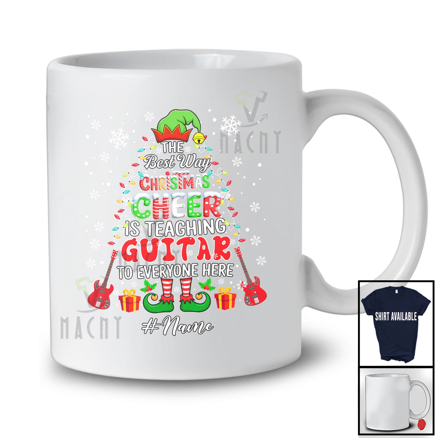 Personalized Custom Name Spread Christmas Cheer Is Teaching Guitar; Lovely Elf X-mas Teacher T-Shirt. This cotton t-shirt is a durable staple product with a classic fit. One of the most popular items, it has a relaxed style made for everyday and casual wear.