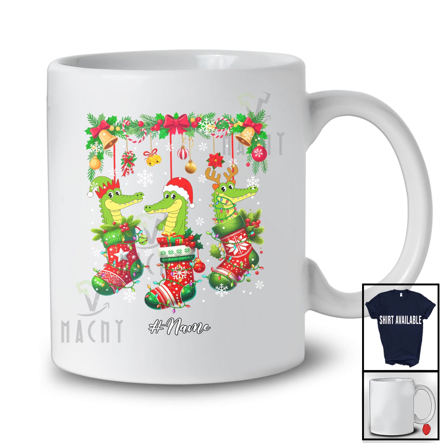 Personalized Custom Name Three Alligator In Christmas Socks; Amusing X-mas Lights Animal T-Shirt. This cotton t-shirt is a durable staple product with a classic fit. One of the most popular items, it has a relaxed style made for everyday and casual wear.