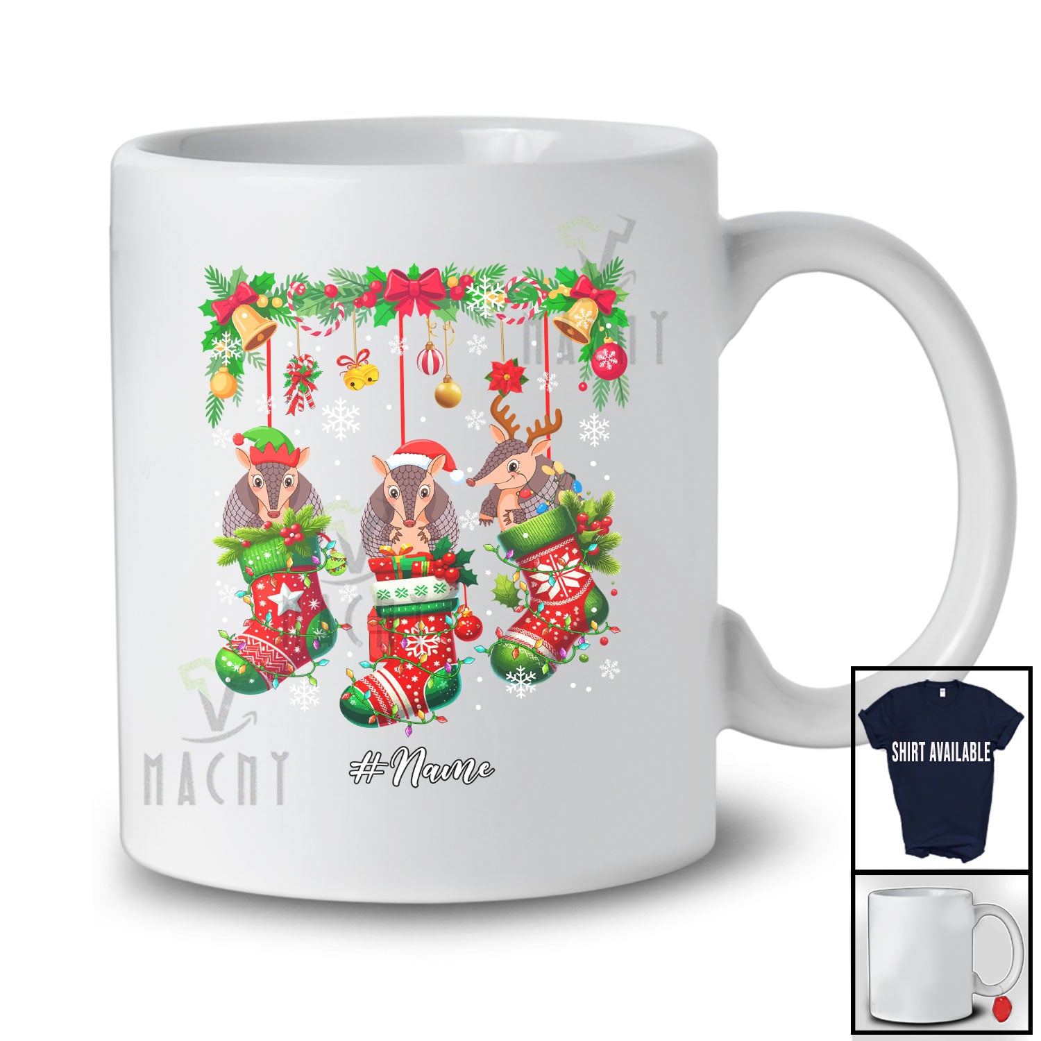 Personalized Custom Name Three Armadillo In Christmas Socks; Amusing X-mas Lights Animal T-Shirt. This cotton t-shirt is a durable staple product with a classic fit. One of the most popular items, it has a relaxed style made for everyday and casual wear.
