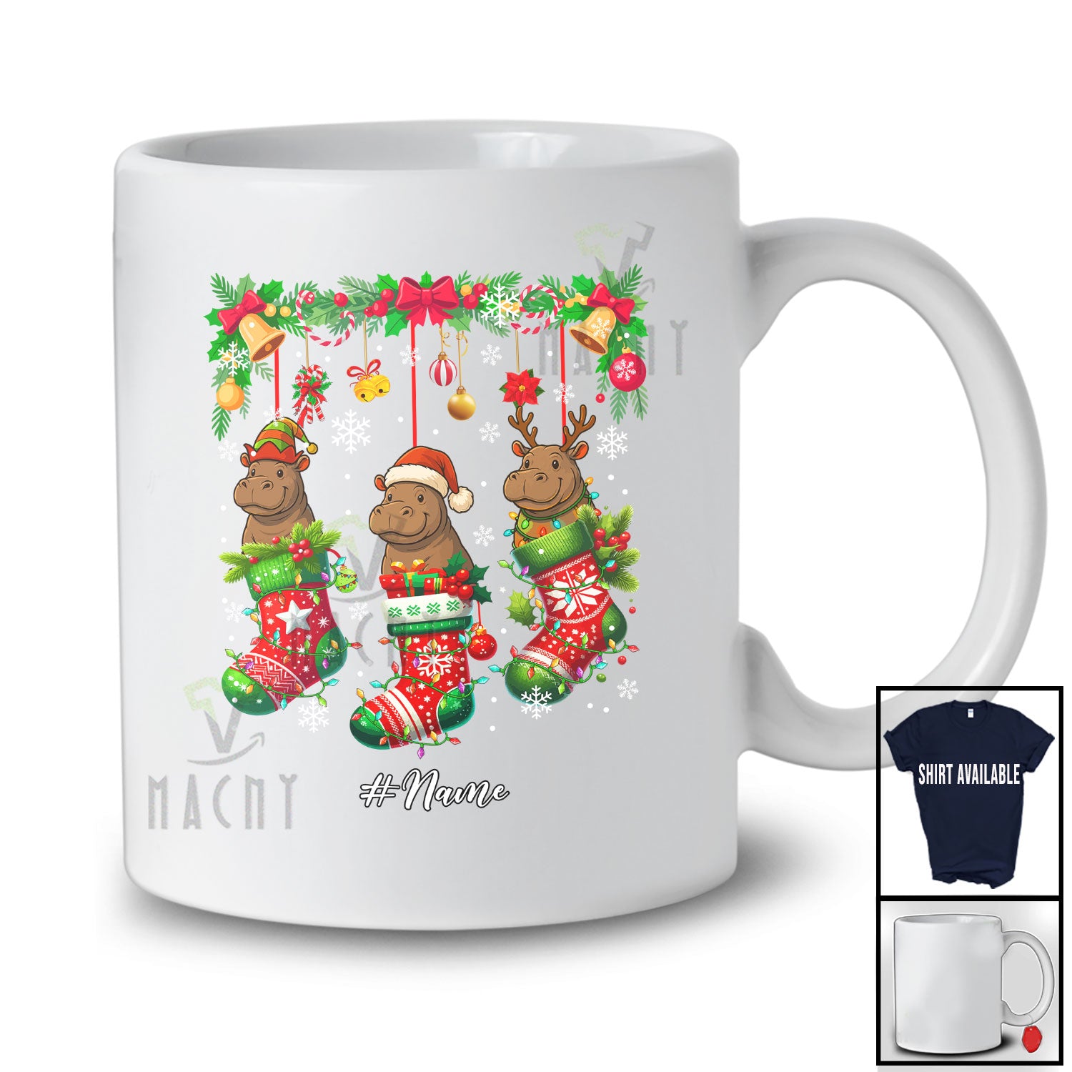 Personalized Custom Name Three Hippo In Christmas Socks; Amusing X-mas Lights Animal Lover T-Shirt. This cotton t-shirt is a durable staple product with a classic fit. One of the most popular items, it has a relaxed style made for everyday and casual wear.