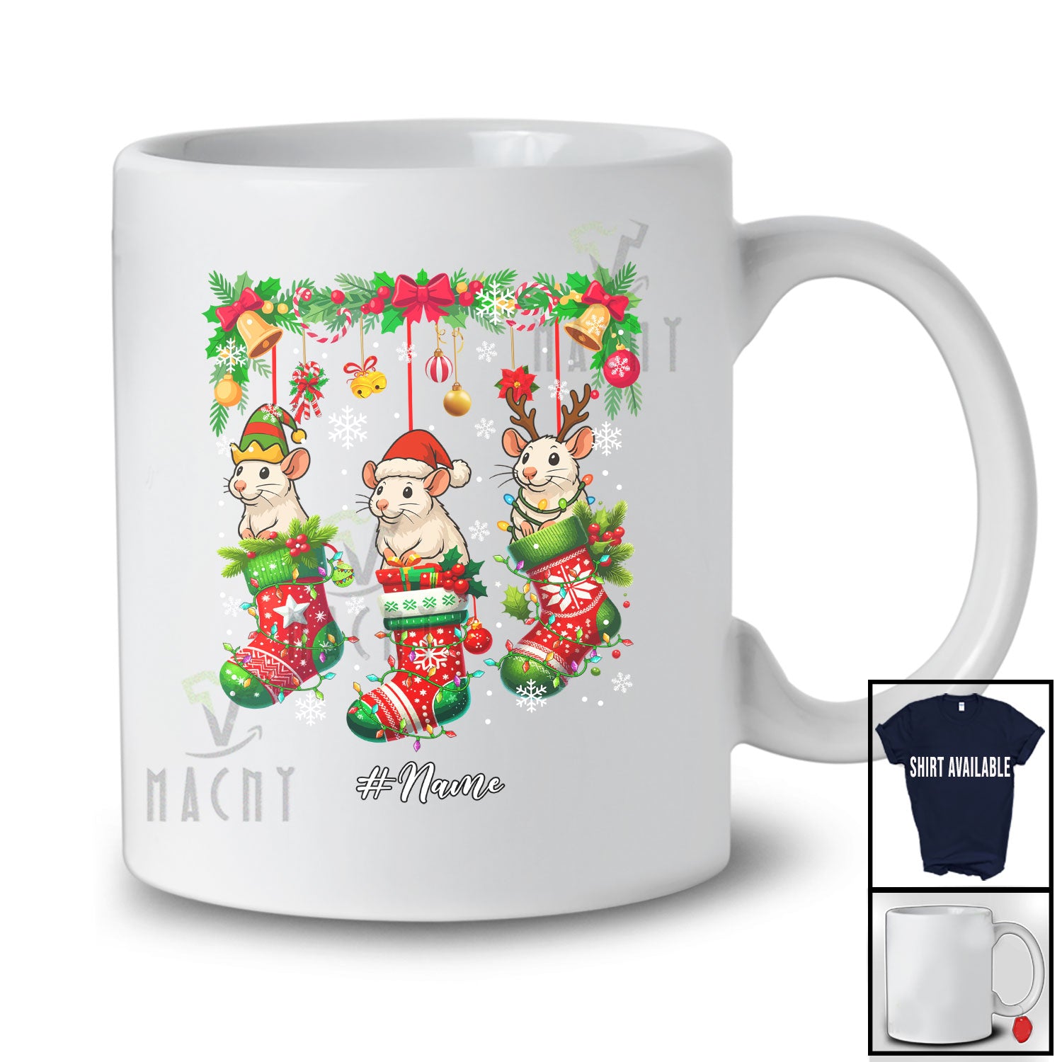 The Personalized Custom Name Three Rat In Christmas Socks; Amusing X-mas Lights Animal Lover T-Shirt destined to impress, and priced at only $12.95, for a limited time.