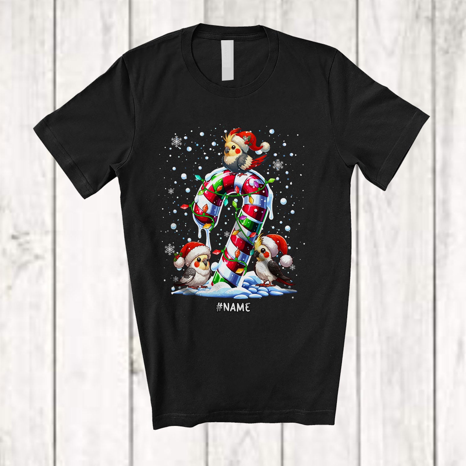 Personalized Custom Name Three Santa Cockatiel On Candy Cane; Amusing Christmas Lights Bird T-Shirt. This cotton t-shirt is a durable staple product with a classic fit. One of the most popular items, it has a relaxed style made for everyday and casual wear.