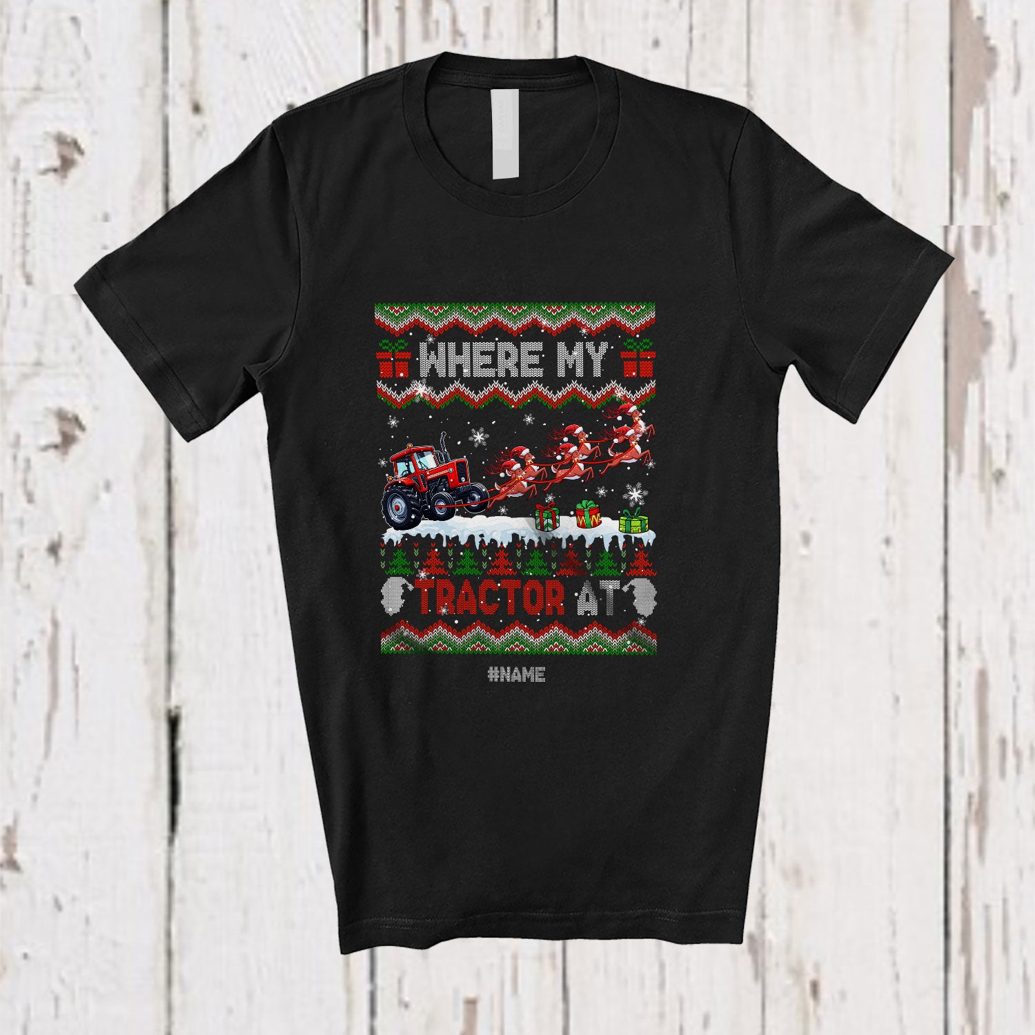 Personalized Custom Name Where My Tractor At; Joyful Christmas Sweater Reindeer Driver T-Shirt. This cotton t-shirt is a durable staple product with a classic fit. One of the most popular items, it has a relaxed style made for everyday and casual wear.