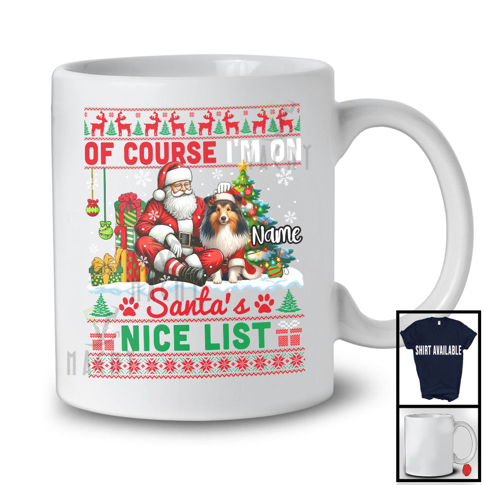 • Personalized I'm on Santa's Nice List, Merry Christmas Sweater Custom Name Shetland Sheepdog Santa T-Shirt. This cotton t-shirt is a durable staple product with a classic fit. One of the most popular items, it has a relaxed style made for everyday and casual wear.