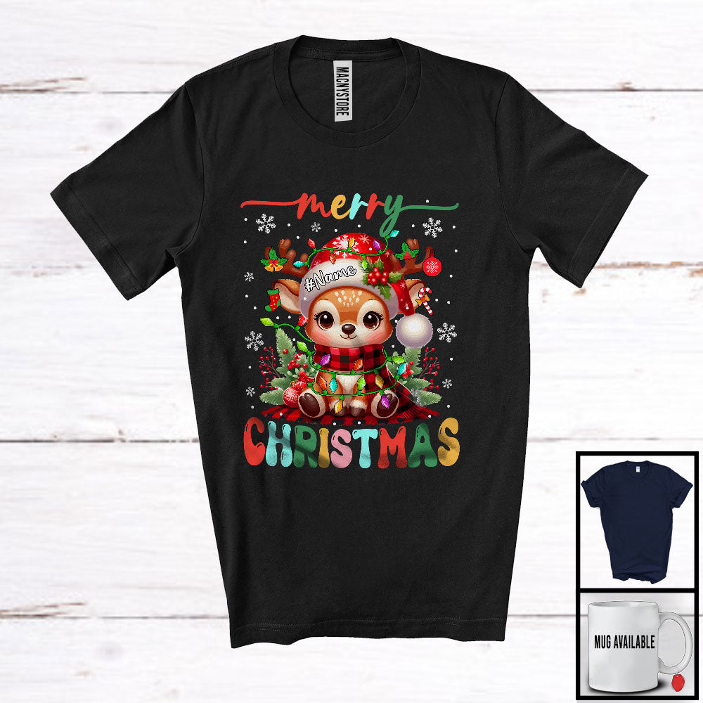 Personalized Merry Christmas; Adorable X-mas Lights Custom Name Reindeer; Joyful Family Group T-Shirt