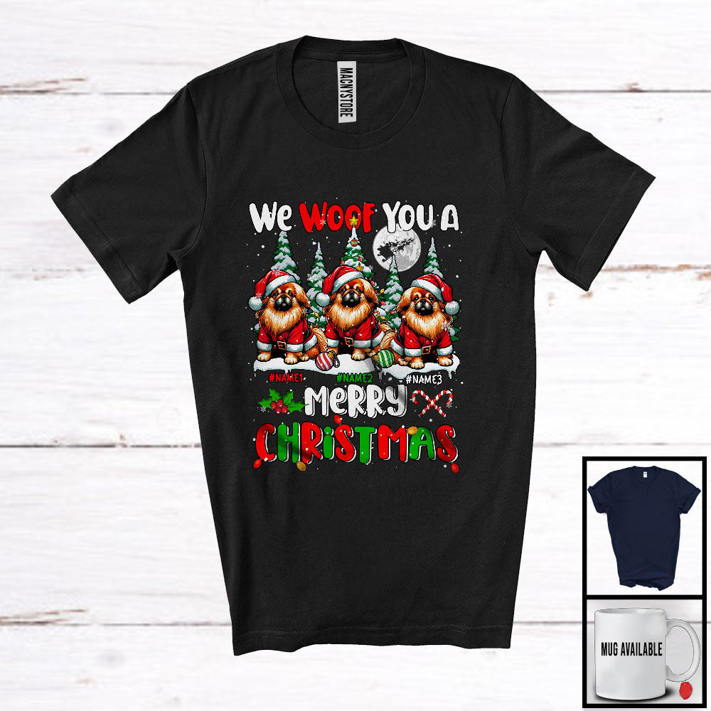 Personalized We Woof You A Merry Christmas; Lovely Three Santa Pekingeses; X-mas Tree T-Shirt