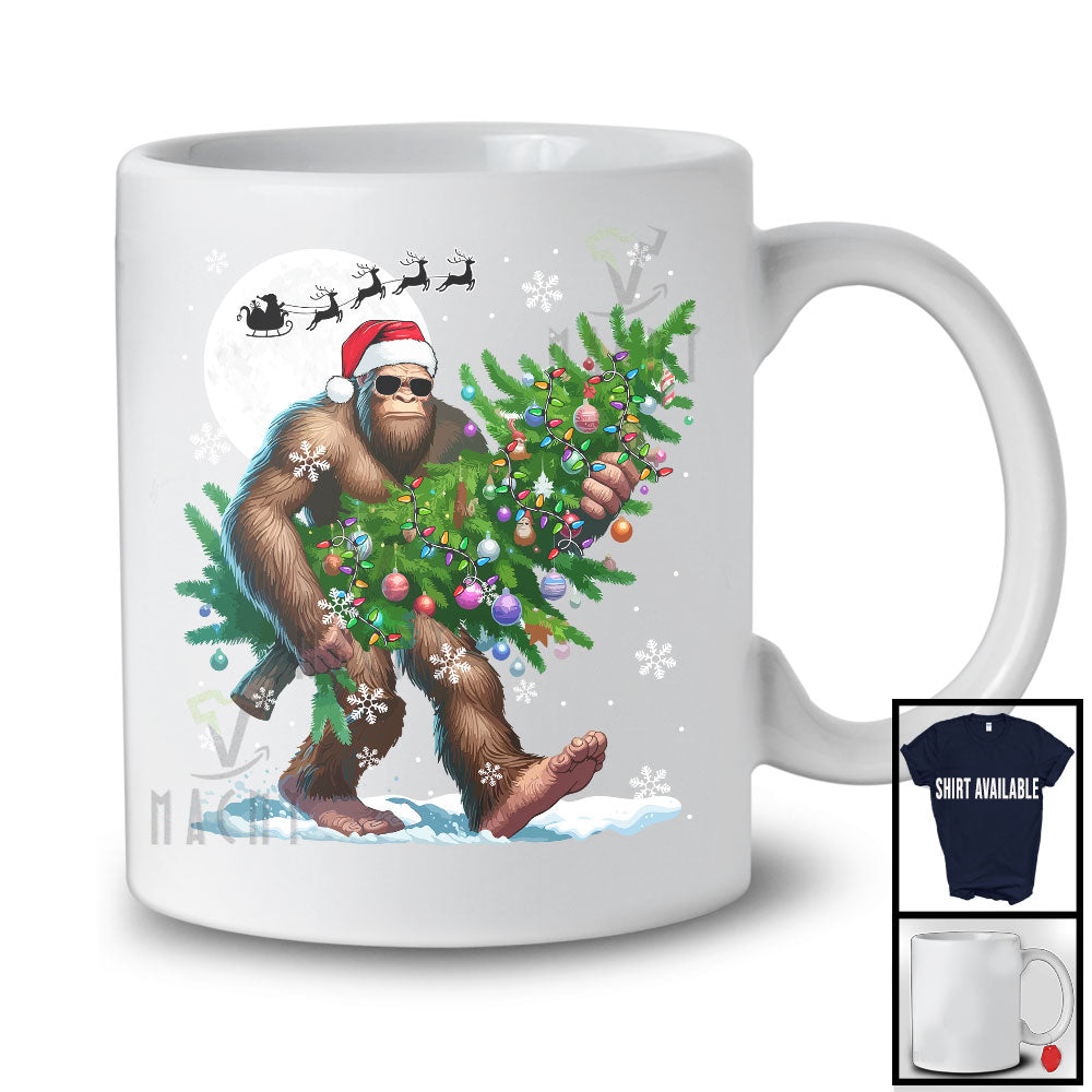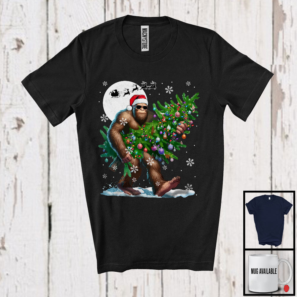 Santa Bigfoot Stolen Christmas Tree; Humorous Christmas Lights Moon Bigfoot Snowing; Family T-Shirt
