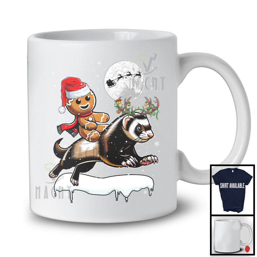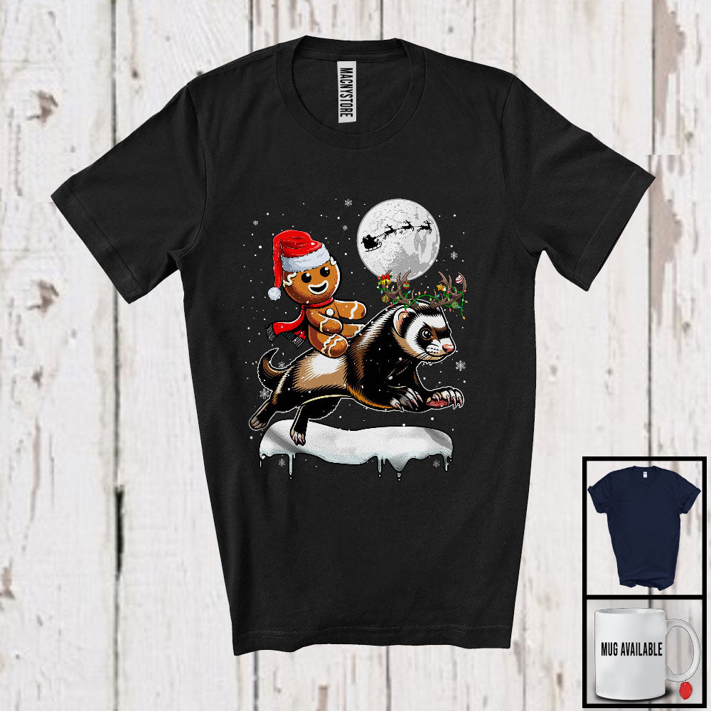 Santa Gingerbread Riding Ferret Reindeer; Lovely Christmas Snowing Wild Animal; Family Group T-Shirt. This cotton t-shirt is a durable staple product with a classic fit. One of the most popular items, it has a relaxed style made for everyday and casual wear.