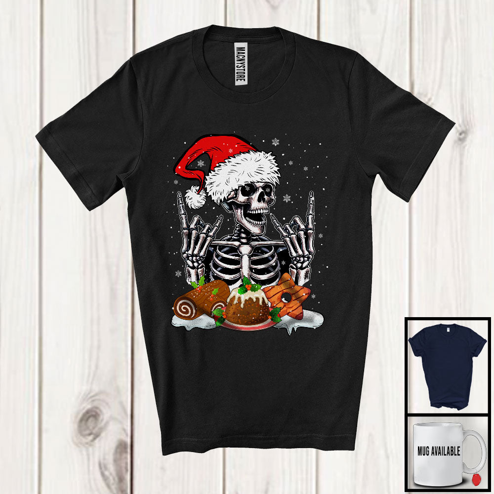 Santa Skeleton With Cookies Cake; Sarcastic Christmas Dinner Skeleton; Snowing Family T-Shirt. This cotton t-shirt is a durable staple product with a classic fit. One of the most popular items, it has a relaxed style made for everyday and casual wear.