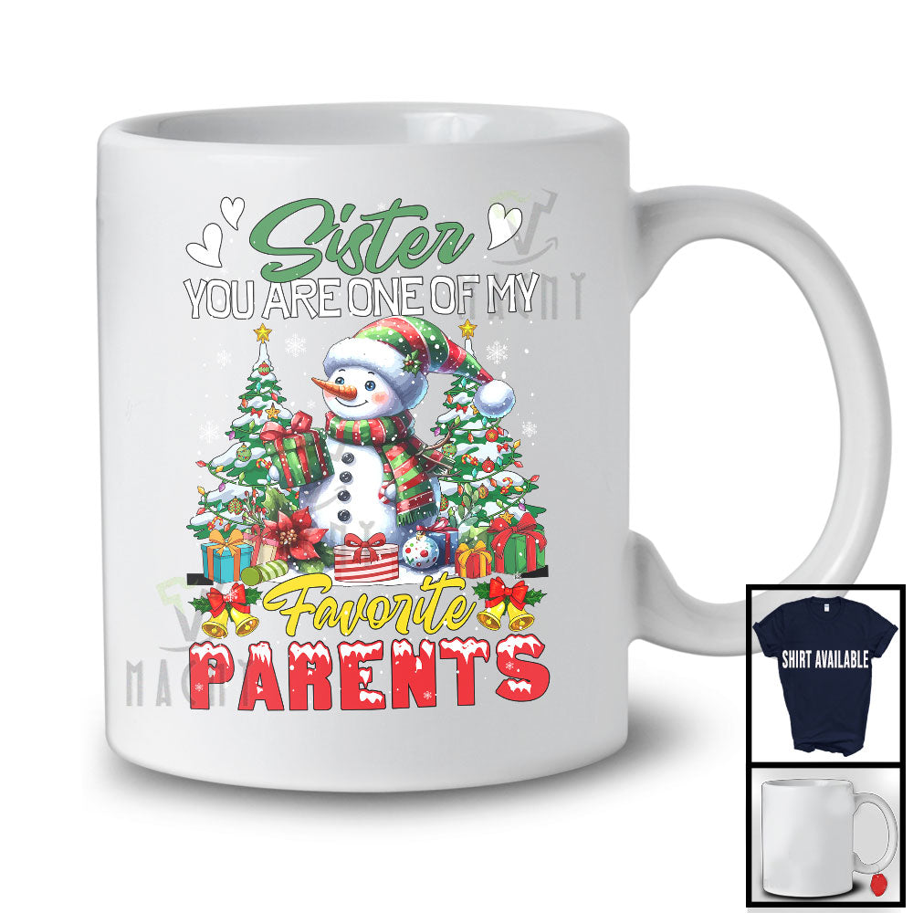• Sister You Are One Of My Favorite Parents; Merry Christmas Tree Snowman Snow; Family Group T-Shirt. This cotton t-shirt is a durable staple product with a classic fit. One of the most popular items, it has a relaxed style made for everyday and casual wear.
