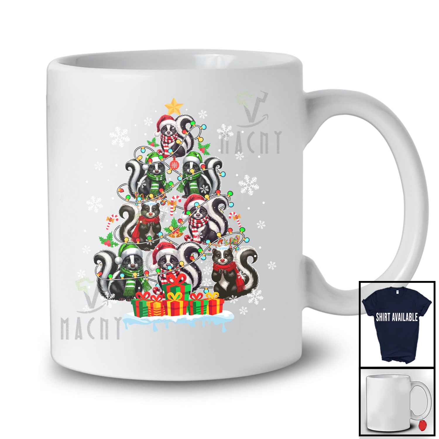Skunk As Christmas Tree; Awesome X-mas Lights Santa Reindeer Elf Skunk; Animal Lover T-Shirt. This cotton t-shirt is a durable staple product with a classic fit. One of the most popular items, it has a relaxed style made for everyday and casual wear.