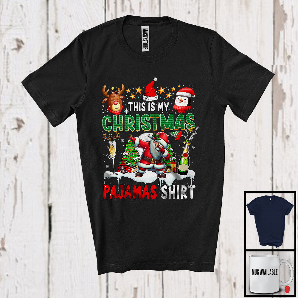 This Is My Christmas Pajamas Shirt; Joyful X-mas Tree Dabbing Santa Champagne; Drinking Drunker T-Shirt. This cotton t-shirt is a durable staple product with a classic fit. One of the most popular items, it has a relaxed style made for everyday and casual wear.