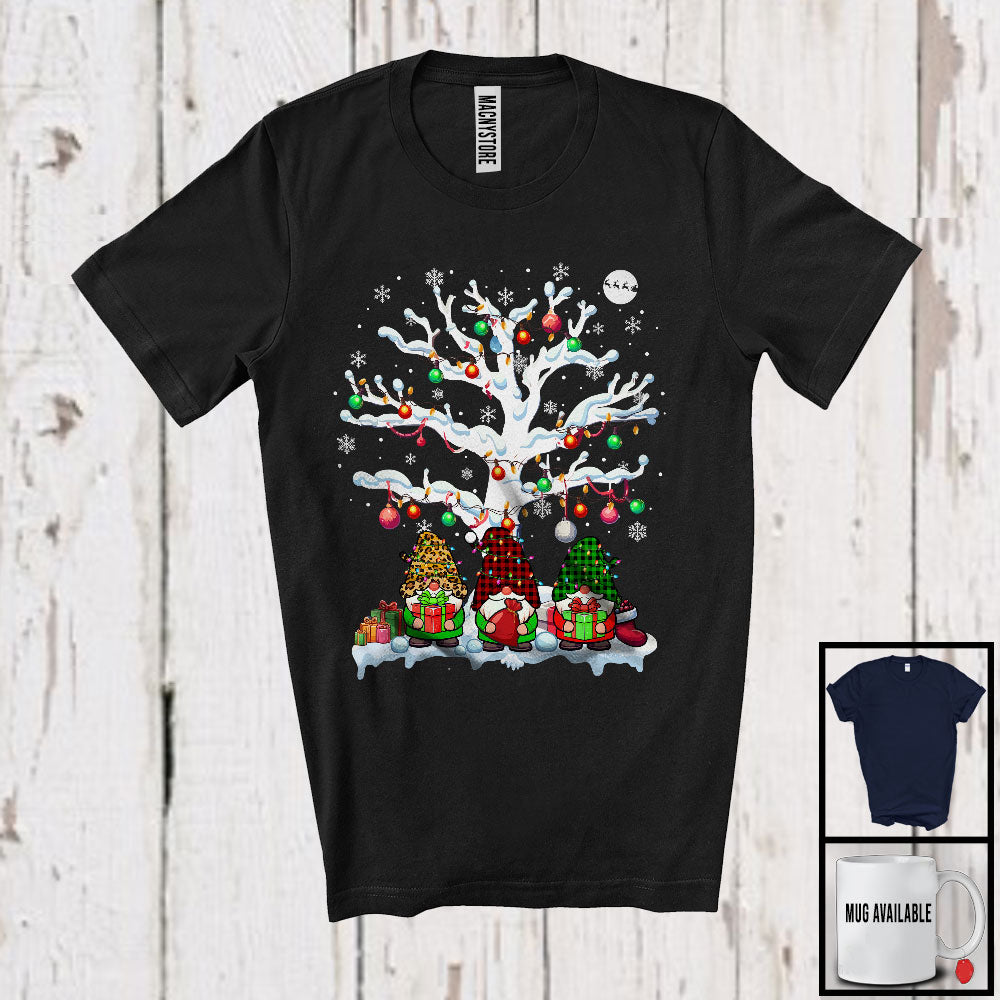 Three Leopard Plaid Gnome Squad; Cheerful Christmas Lights Snowing; Gnomies Family Group T-Shirt