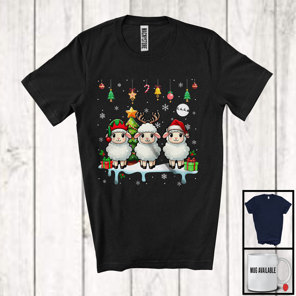 Three Reindeer Santa Elf Sheep; Cheerful Christmas Lights Sheep; X-mas Animal Lover T-Shirt