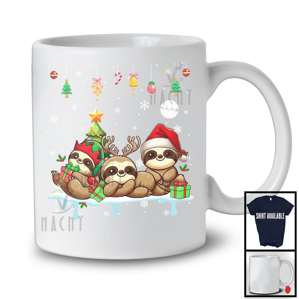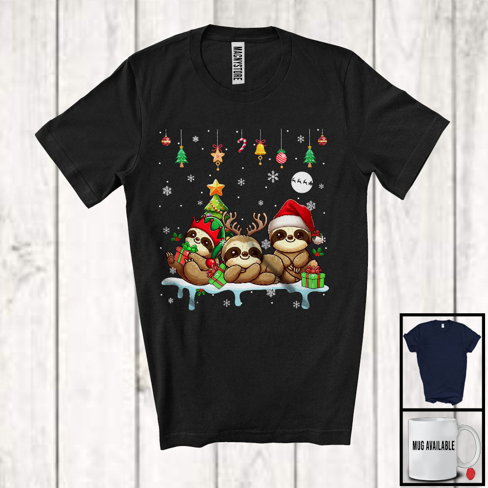 Three Reindeer Santa Elf Sloth; Cheerful Christmas Lights Sloth; X-mas Animal Lover T-Shirt