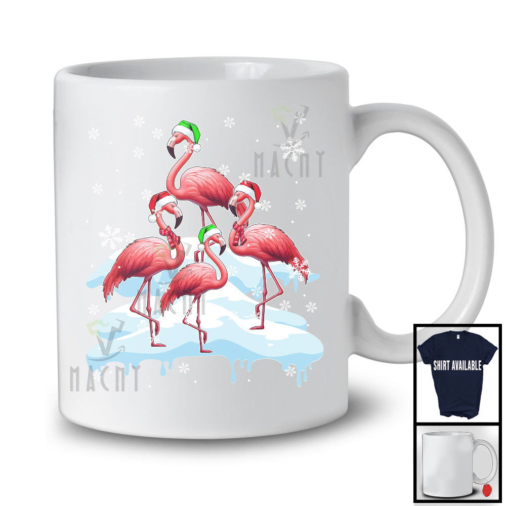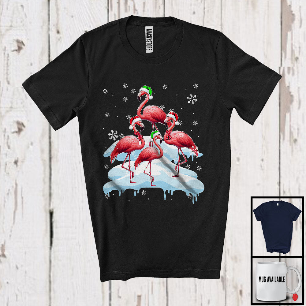 Three Santa Elf Flamingos On Snow; Adorable Christmas Snowing Flamingo Lover; Family Group T-Shirt