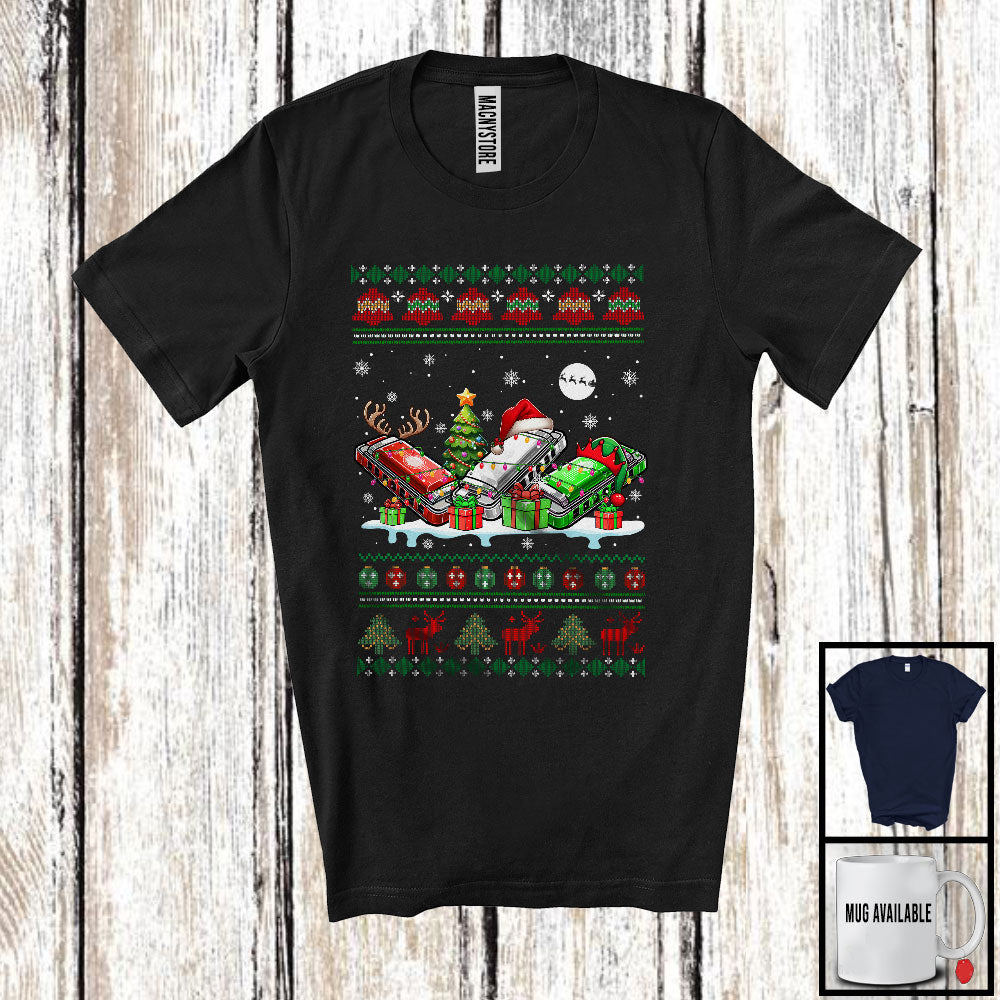 Three Santa Elf Reindeer Harmonica; Cheerful Christmas Tree Sweater Snow; Musical Instruments T-Shirt