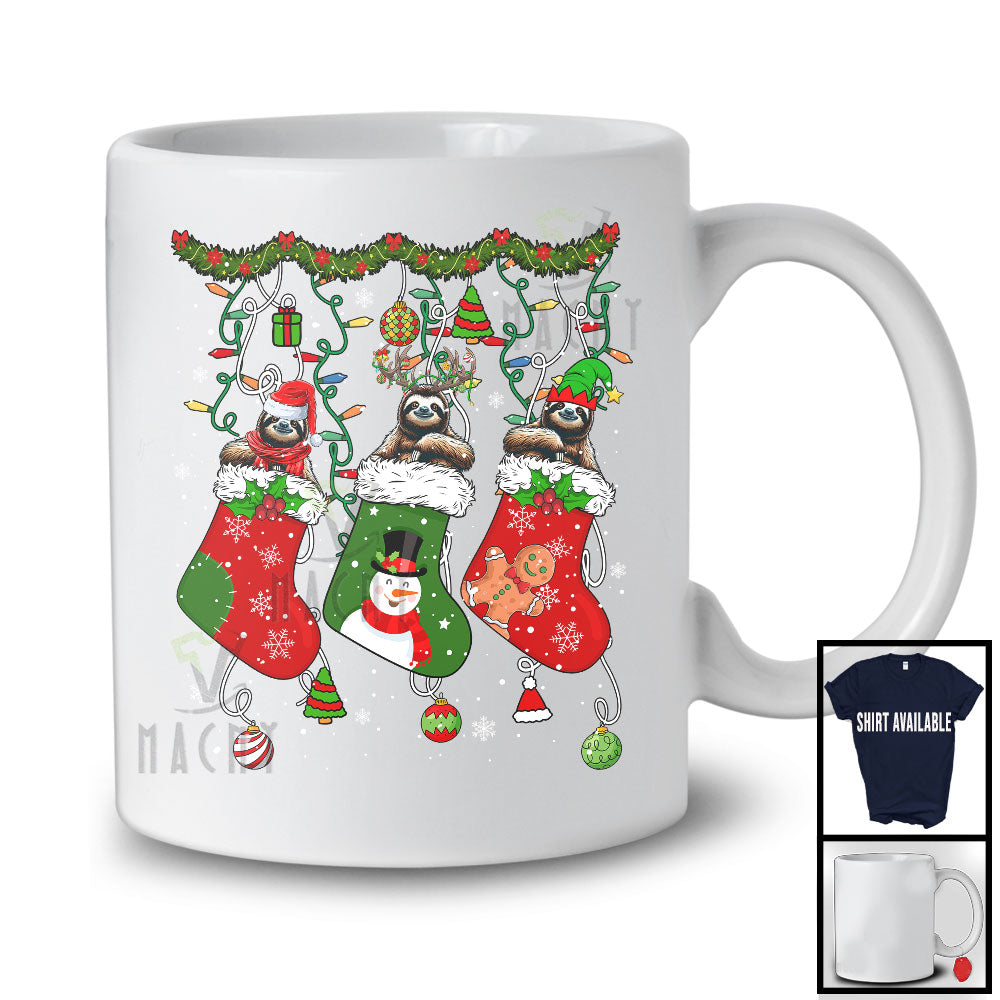 new MacnyStore - Three Santa Elf Reindeer Sloth In Christmas Socks; Awesome X-mas Lights Snowing; Animal T-Shirt – Macnystore