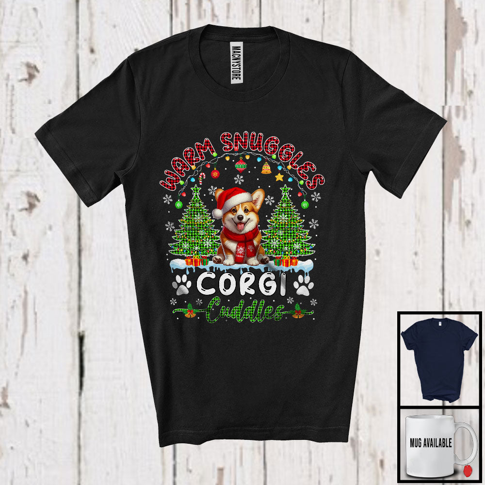 Warm Snuggles Corgi Cuddles; Fantastic Christmas Lights Tree Plaid Santa Dog; X-mas Snowing T-Shirt