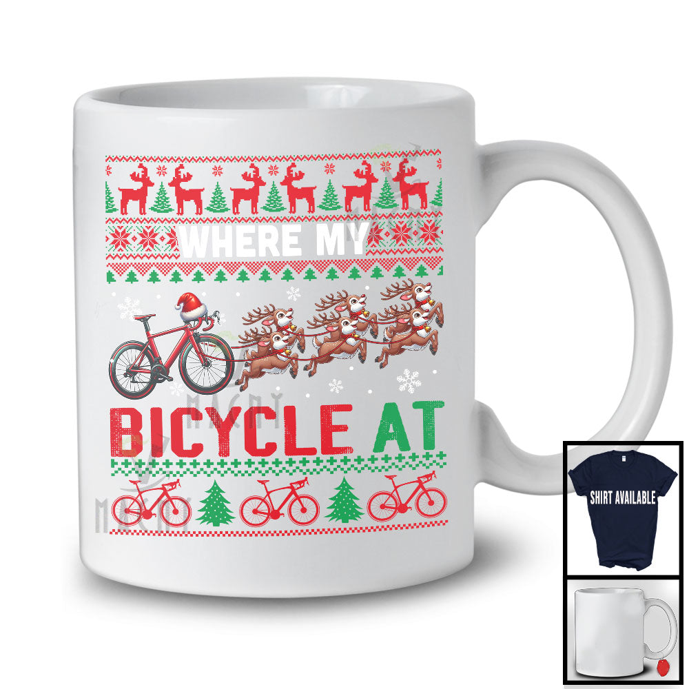 The Where My Bicycle At; Humorous Christmas Sweater Santa Reindeer Bicycle Riding; X-mas T-Shirt destined to impress, and priced at only $12.95, for a limited time.