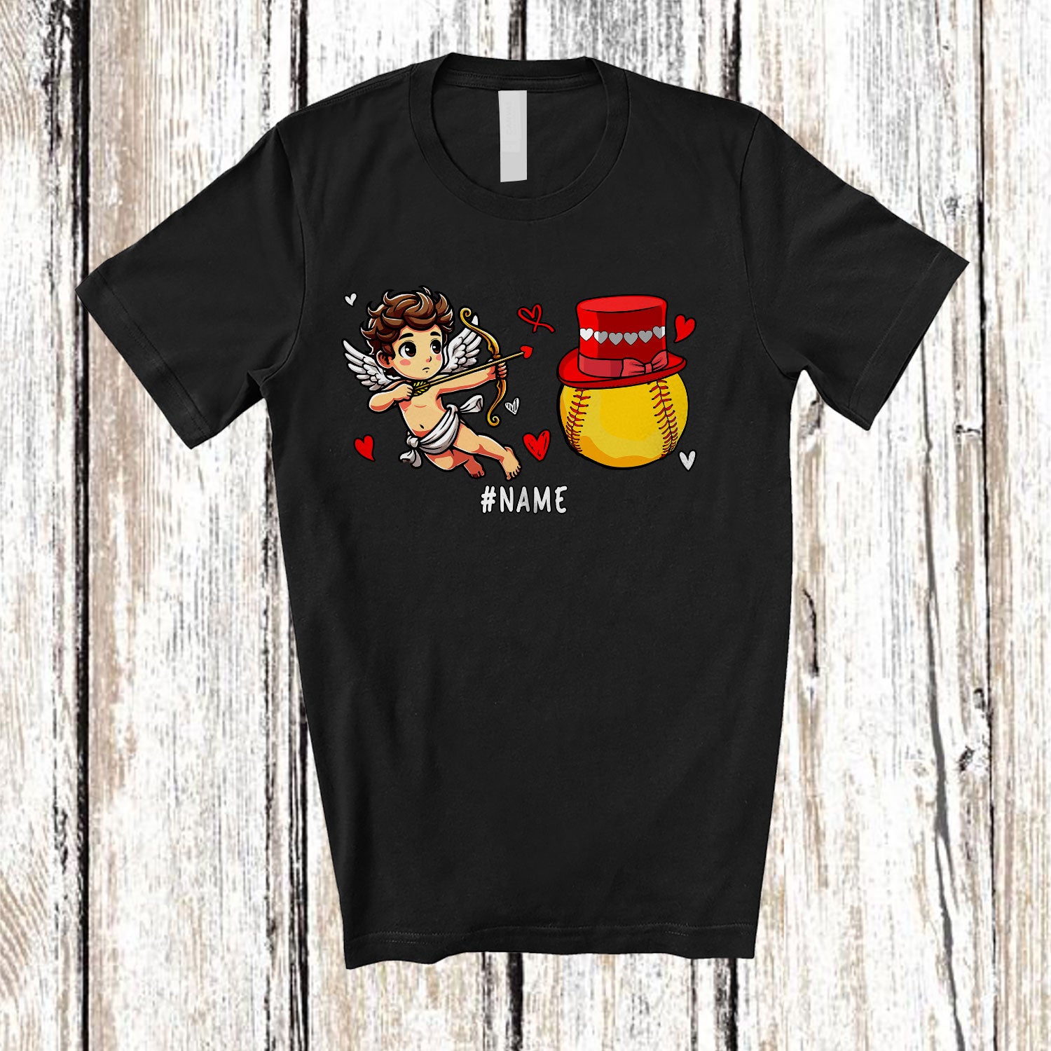 Personalized Cupid With Softball Ball; Lovely Valentine Hearts; Custom Name Softball Player T-Shirt