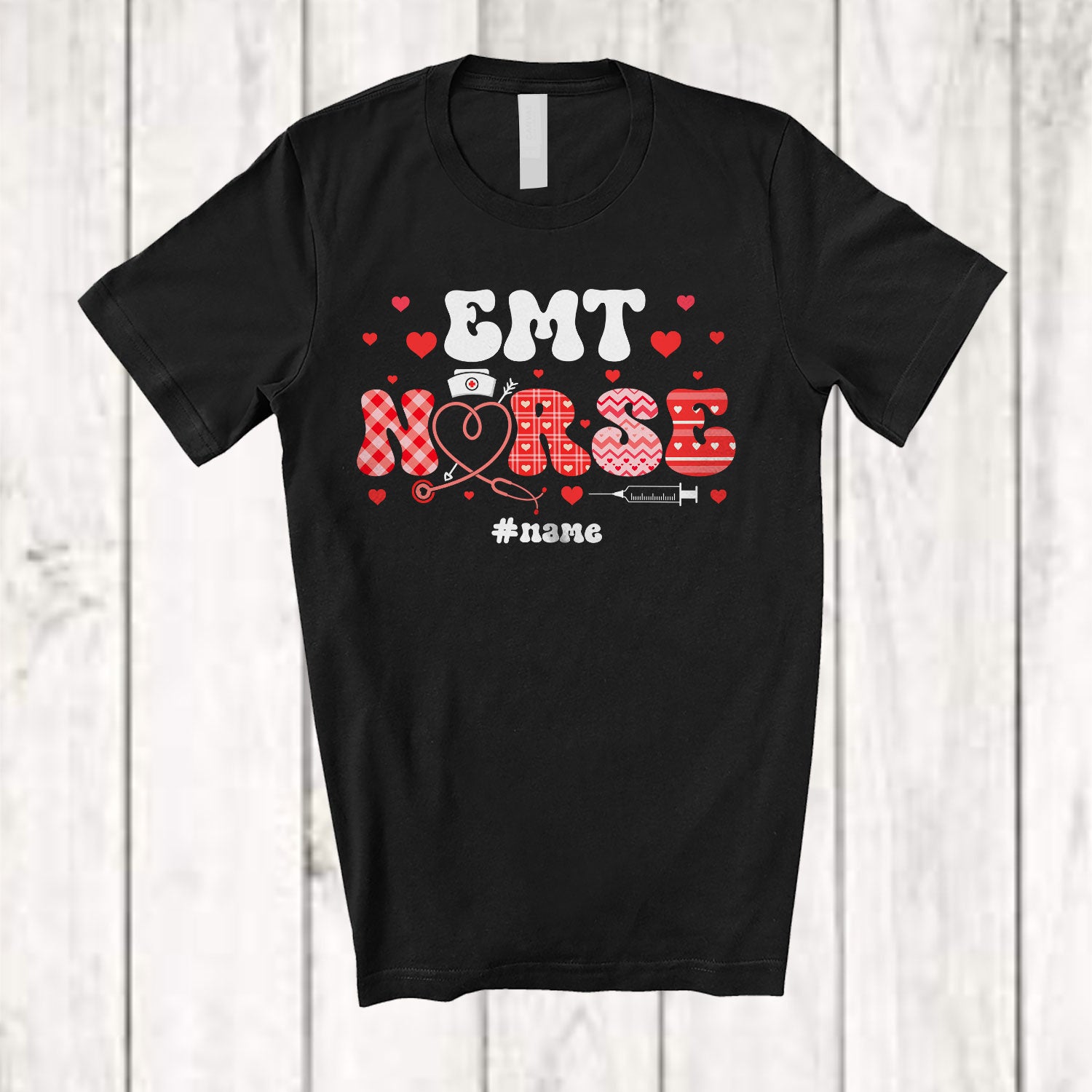 Personalized Custom Name EMT Nurse; Amazing Valentine Plaid Hearts Stethoscope; Nursing T-Shirt