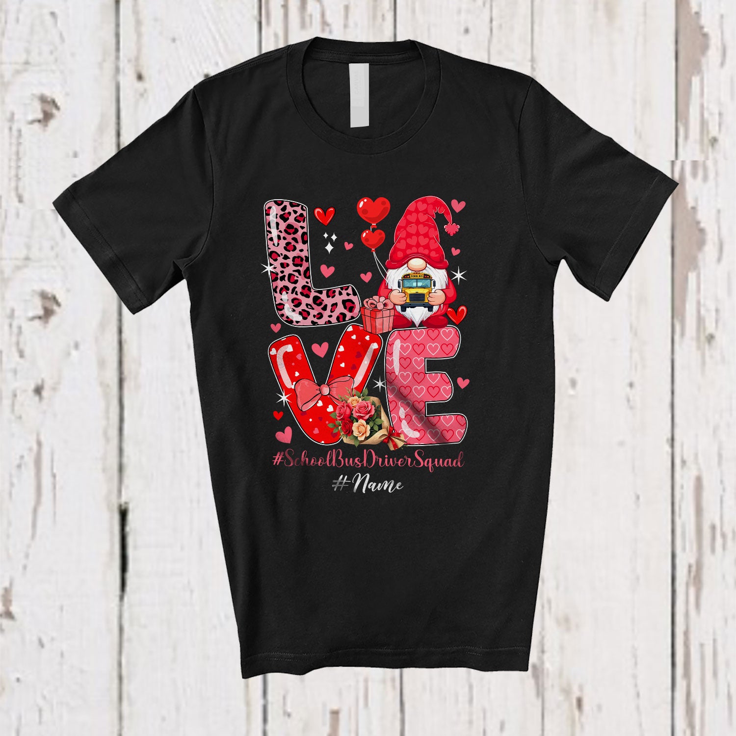 Personalized Custom Name Love School Bus Driver Squad; Lovely Valentine Hearts Gnome Leopard T-Shirt