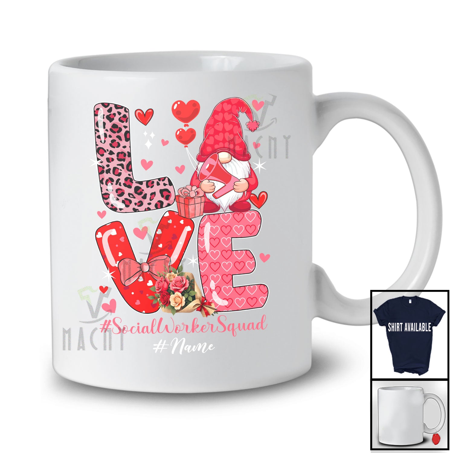 • Personalized Custom Name Love Social Worker Squad; Lovely Valentine Hearts Gnome Leopard T-Shirt. This cotton t-shirt is a durable staple product with a classic fit. One of the most popular items, it has a relaxed style made for everyday and casual wear.