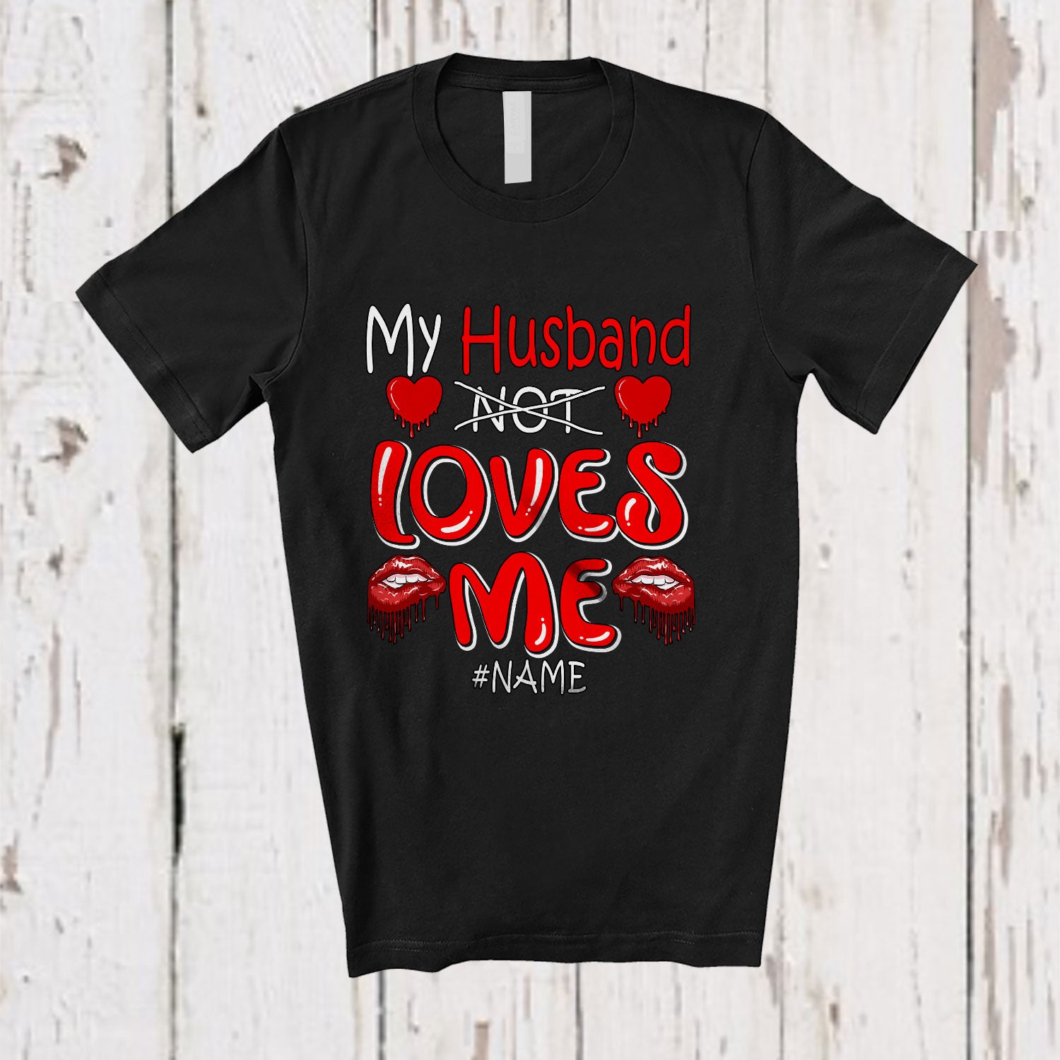 • Personalized My Husband Loves Me; Sarcastic Valentine Hearts; Custom Name Couple Family T-Shirt. This cotton t-shirt is a durable staple product with a classic fit. One of the most popular items, it has a relaxed style made for everyday and casual wear.