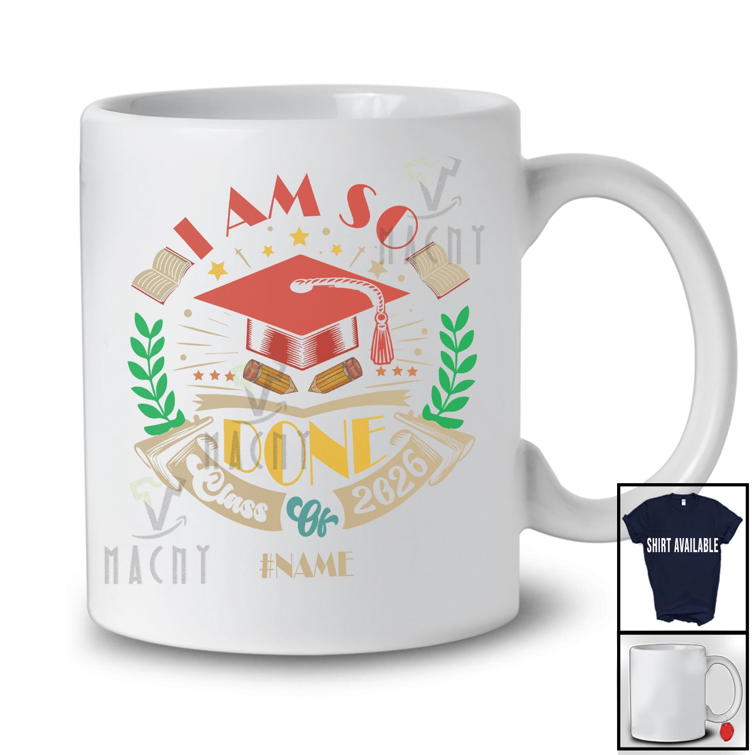 Personalized Custom Name Class of 2026 I Am So Done; Proud Graduation Women Men Graduate T-Shirt. This cotton t-shirt is a durable staple product with a classic fit. One of the most popular items, it has a relaxed style made for everyday and casual wear.