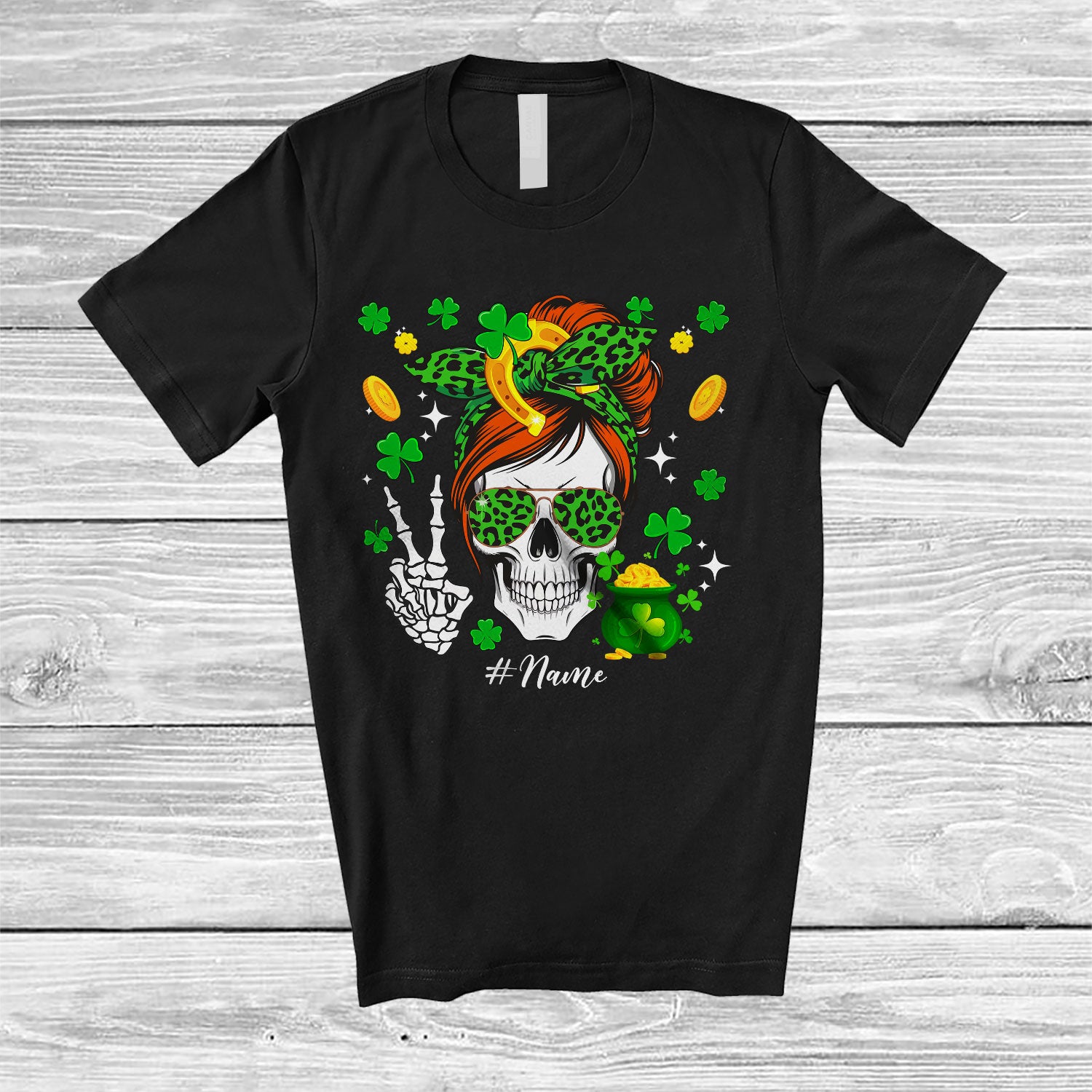 Personalized Custom Name Skull Messy Bun Hair; Amazing St. Patrick's Day Women Family T-Shirt. This cotton t-shirt is a durable staple product with a classic fit. One of the most popular items, it has a relaxed style made for everyday and casual wear.