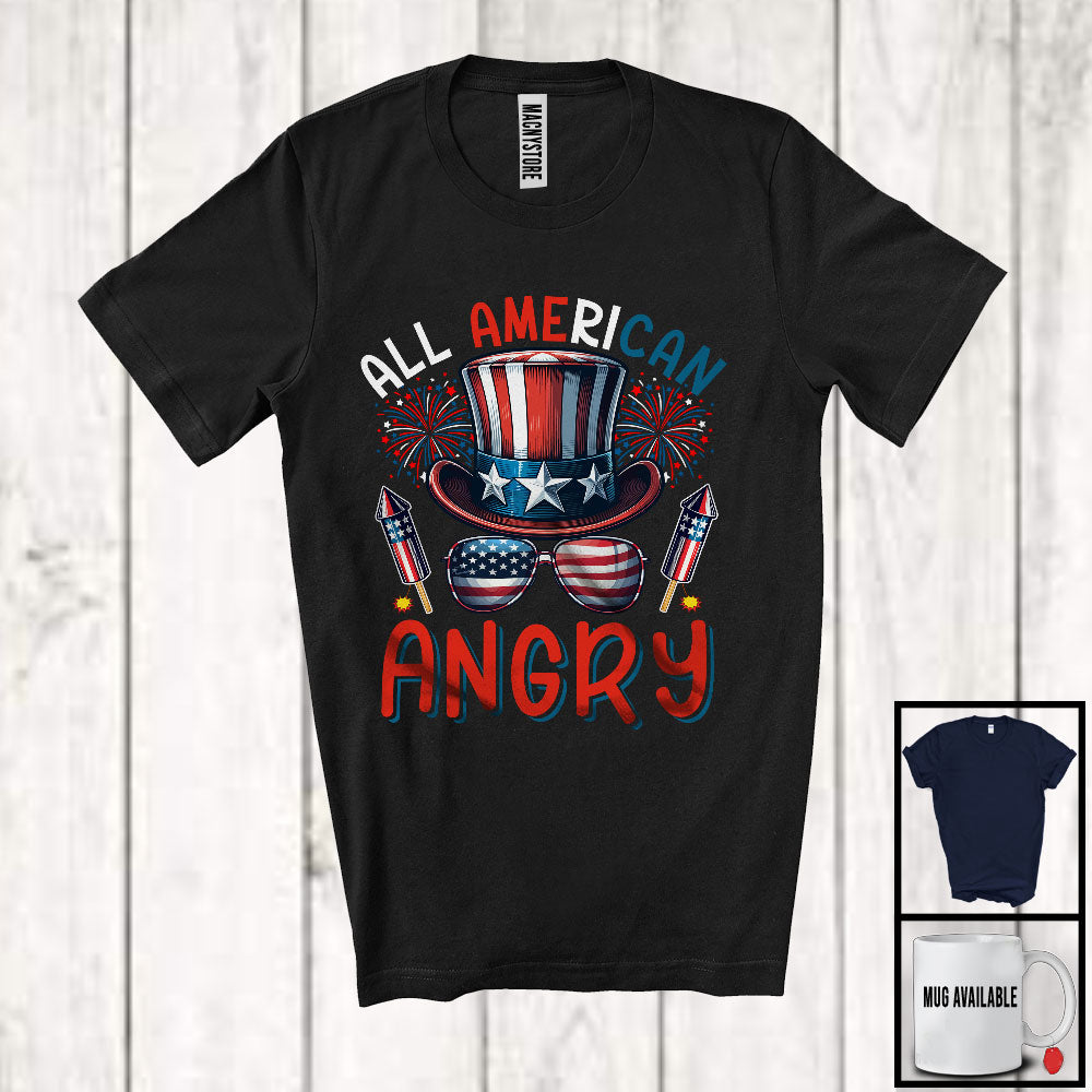 • All American Angry, Amazing 4th Of July American Flag Uncle Sam Hat Sunglasses, Patriotic T-Shirt. This cotton t-shirt is a durable staple product with a classic fit. One of the most popular items, it has a relaxed style made for everyday and casual wear.