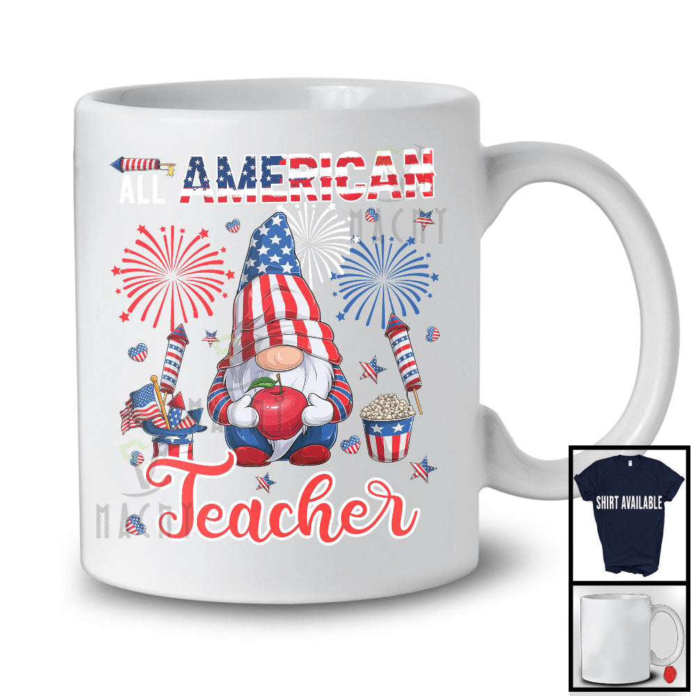 • All American Teacher, Proud 4th Of July American Flag Fireworks Gnome, Teacher Patriotic T-Shirt. This cotton t-shirt is a durable staple product with a classic fit. One of the most popular items, it has a relaxed style made for everyday and casual wear.