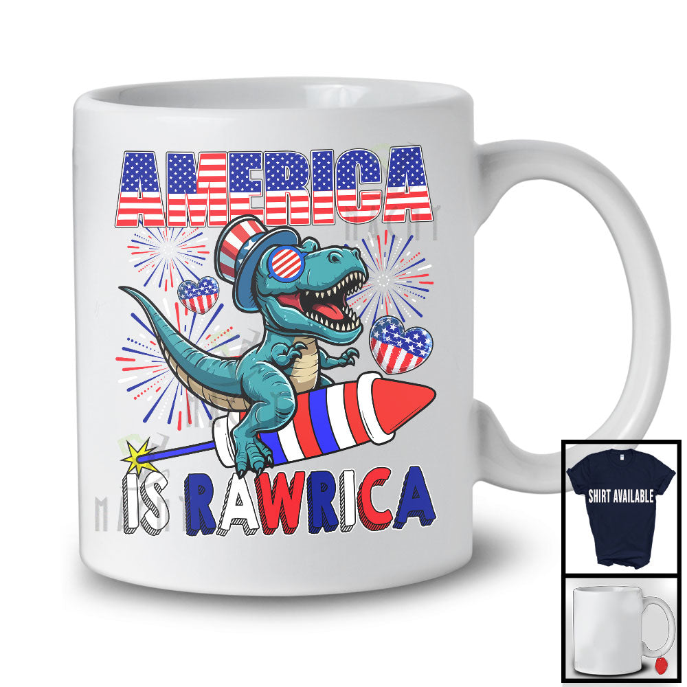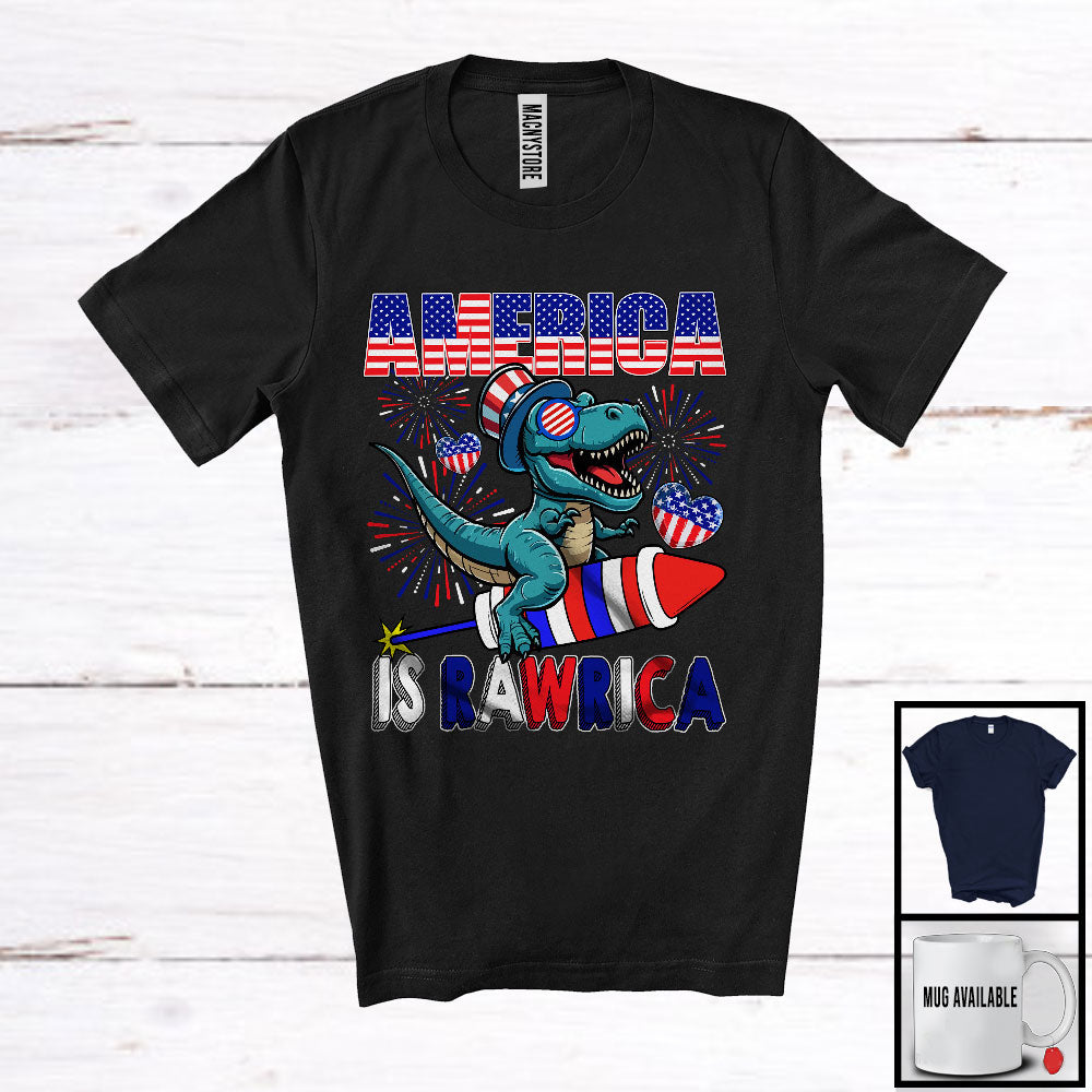 America Is Rawrica, Cheerful 4th Of July T-Rex Dinosaur Riding Firecracker, American Flag Patriotic T-Shirt