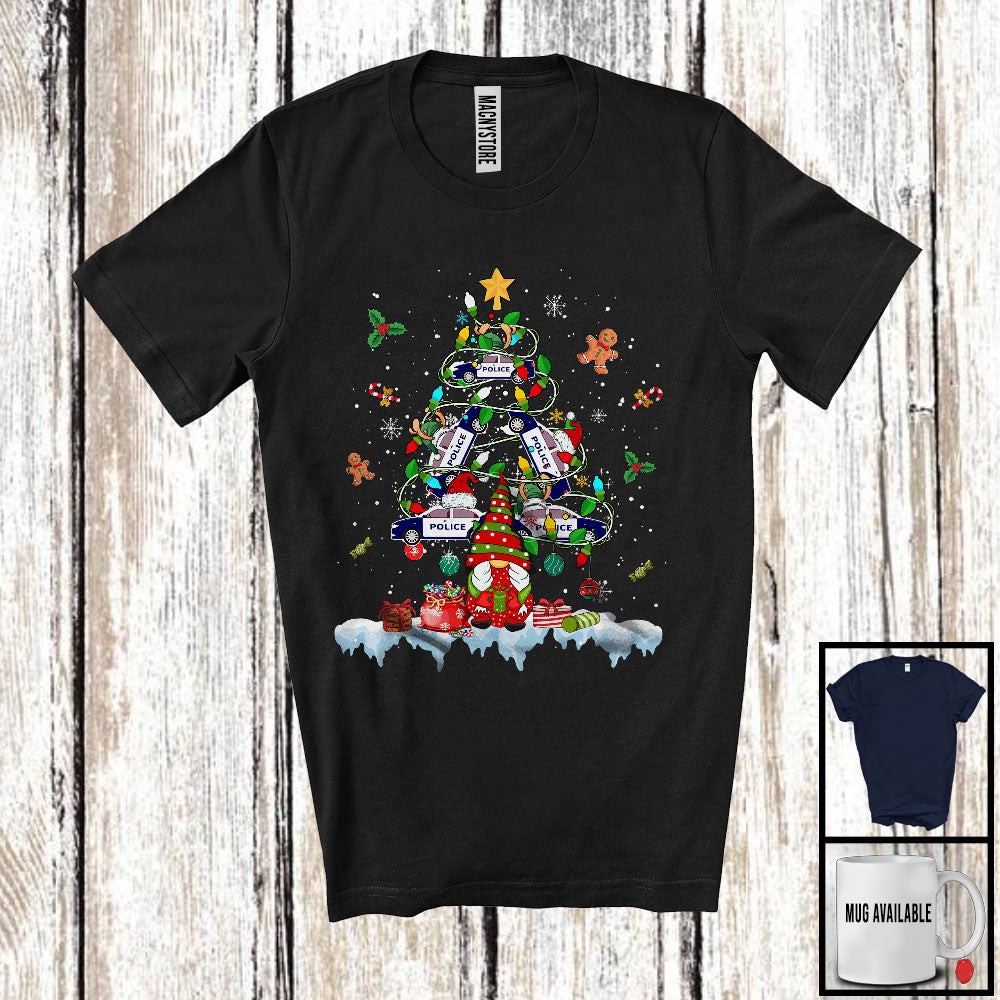 Christmas Tree Lights Police Car With Gnome, Cheerful X-mas Snowing Gnomies, Family Group T-Shirt. This cotton t-shirt is a durable staple product with a classic fit. One of the most popular items, it has a relaxed style made for everyday and casual wear.