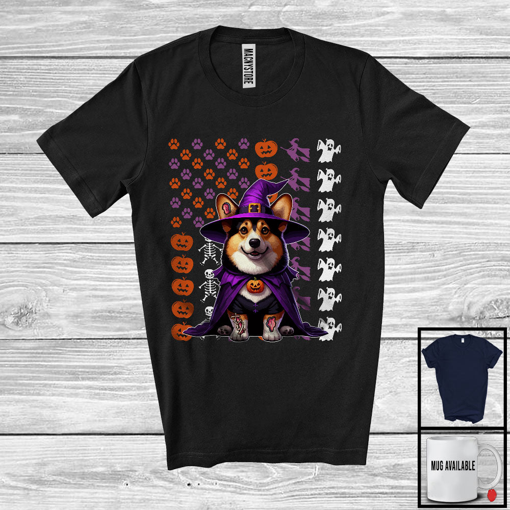 Corgi Witch On American Flag, Adorable Halloween Pumpkin Paws, Patriotic Group T-Shirt