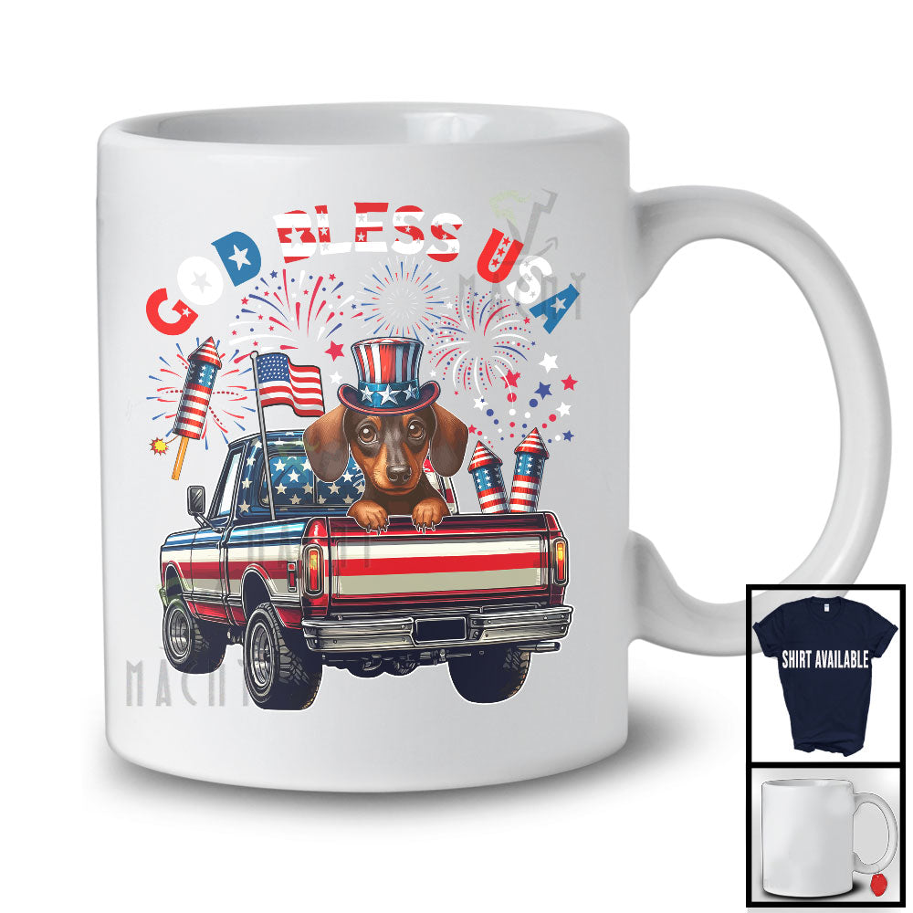 • God Bless USA, Happy 4th Of July Dachshund On Pickup Truck, American Flag Patriotic Proud T-Shirt. This cotton t-shirt is a durable staple product with a classic fit. One of the most popular items, it has a relaxed style made for everyday and casual wear.
