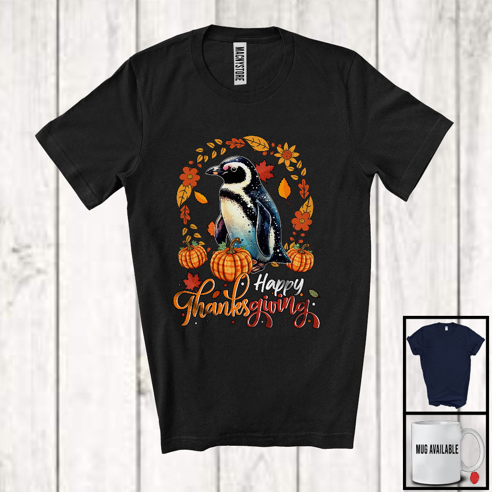 Happy Thanksgiving; Lovely Autumn Fall Leaves Circle Penguin Pumpkin; Sea Animal Lover T-Shirt