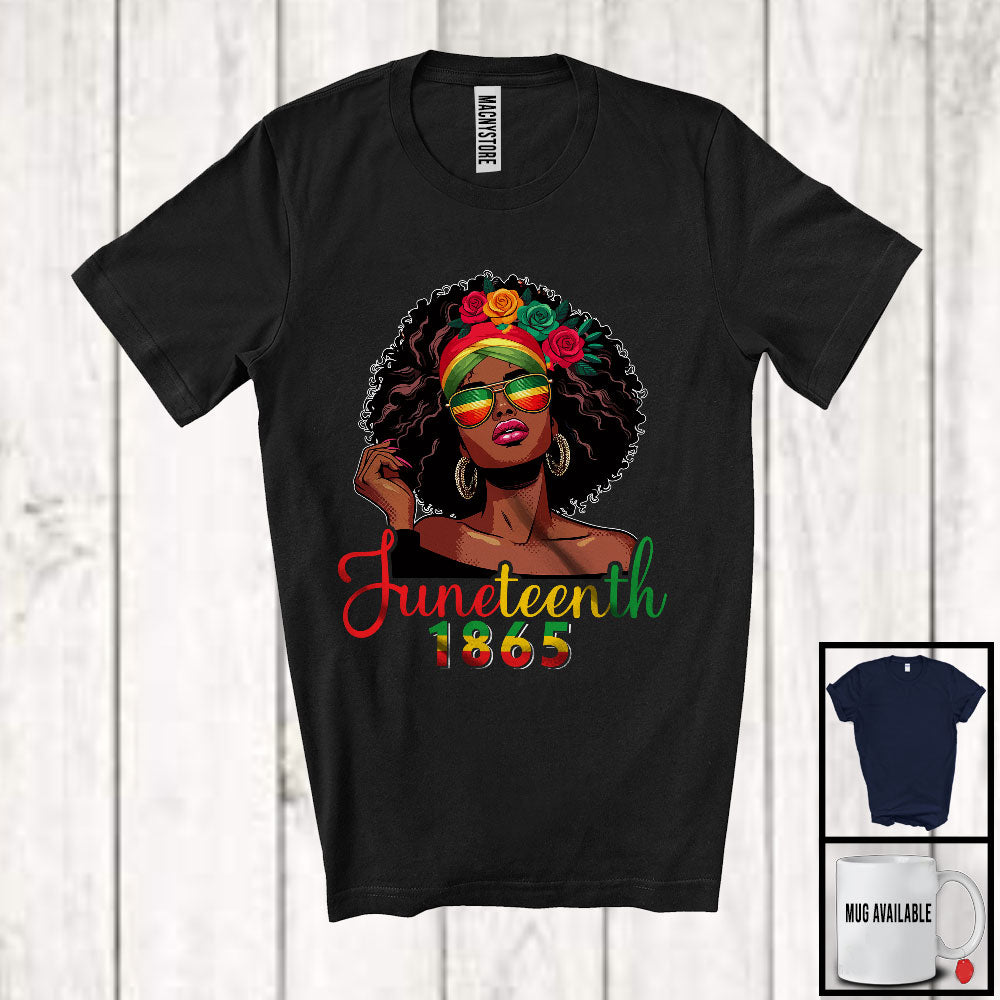 • Juneteenth 1865, Proud African American Afro Girl Women, Black History Melanin Family Group T-Shirt. This cotton t-shirt is a durable staple product with a classic fit. One of the most popular items, it has a relaxed style made for everyday and casual wear.