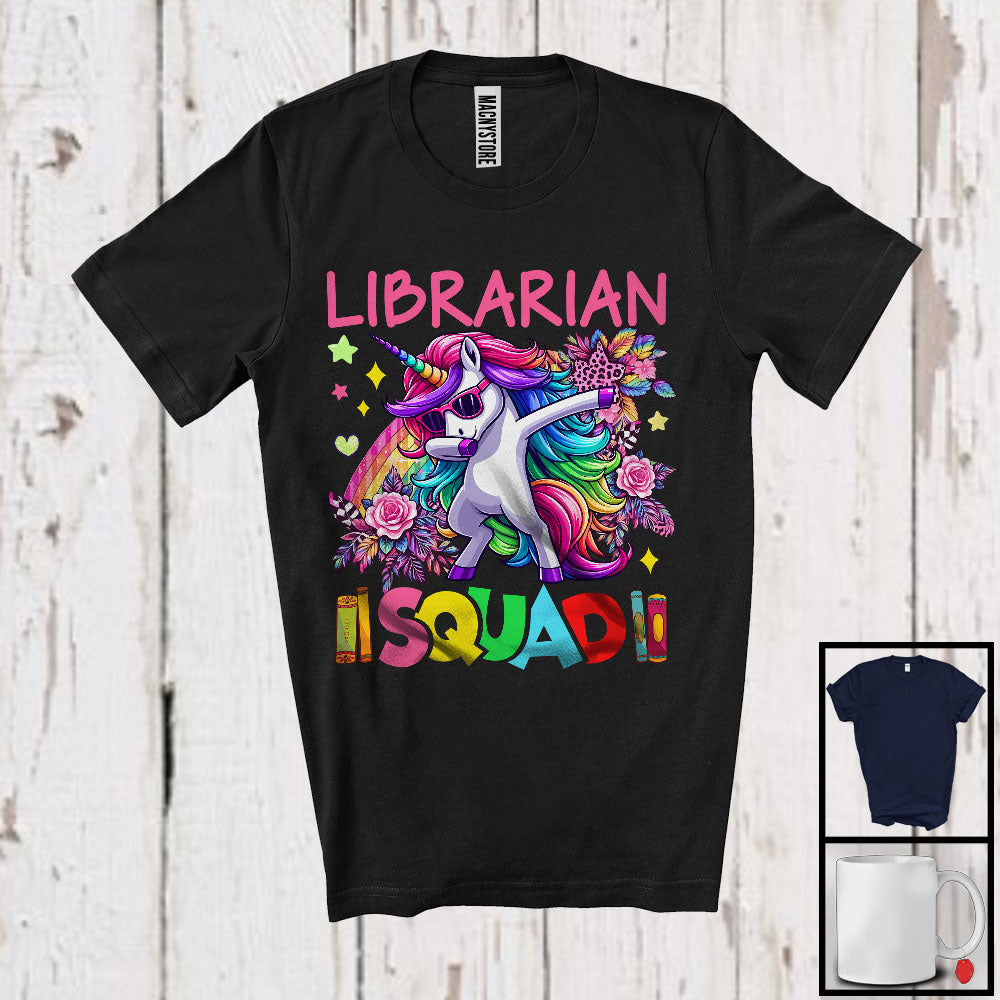 Escouade de bibliothécaires, jolies lunettes de soleil Licorne Dabbing, fleurs léopard, T-Shirt du groupe de bibliothécaires