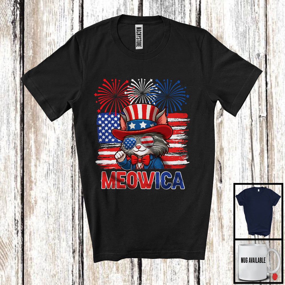 Meowica, Humorous 4th Of July Cat Wearing Sunglasses, Fireworks American Flag Patriotic T-Shirt