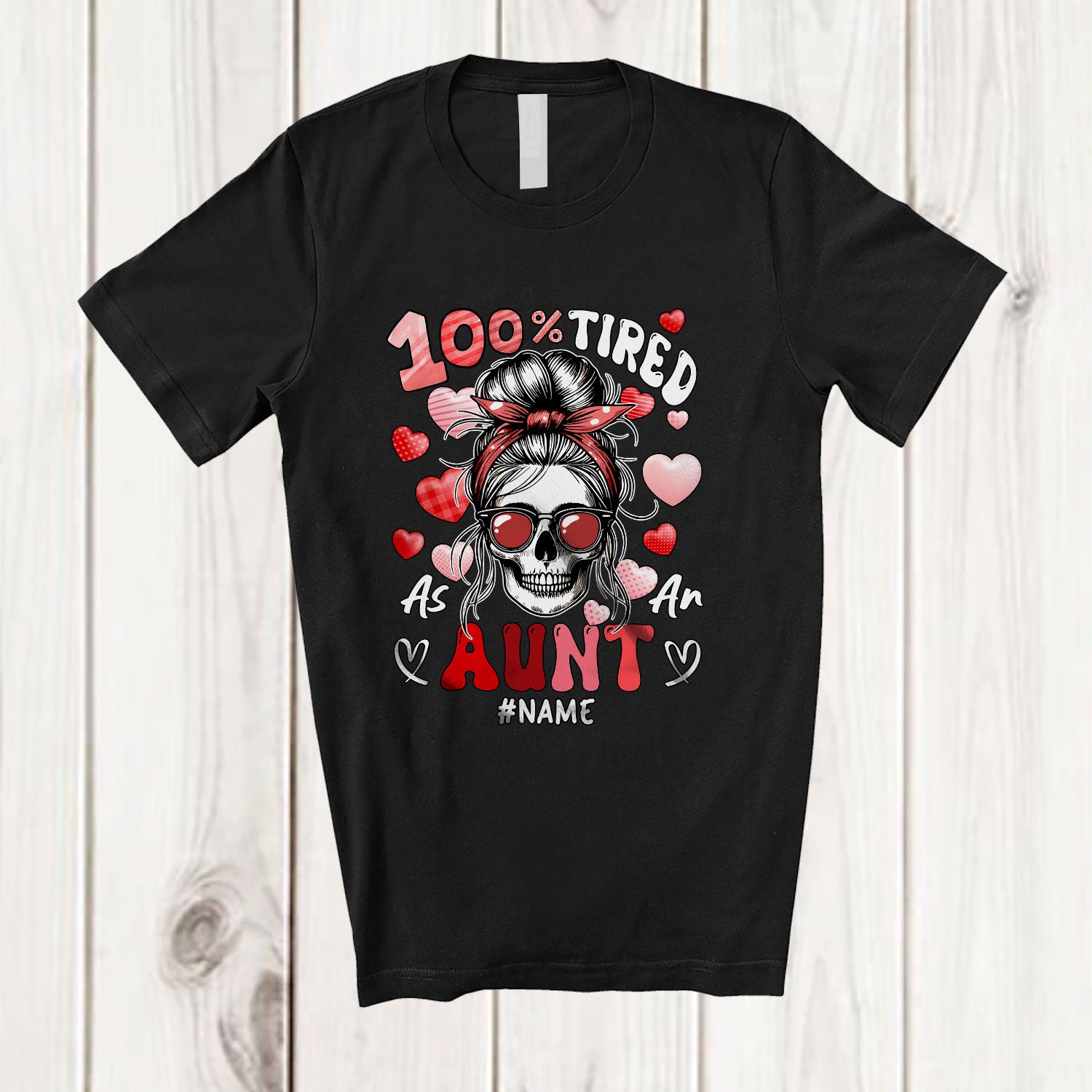 • Personalized 100% Tired as An Aunt; Humorous Mother's Day Custom Name Messy Bun Hair Skull T-Shirt. This cotton t-shirt is a durable staple product with a classic fit. One of the most popular items, it has a relaxed style made for everyday and casual wear.