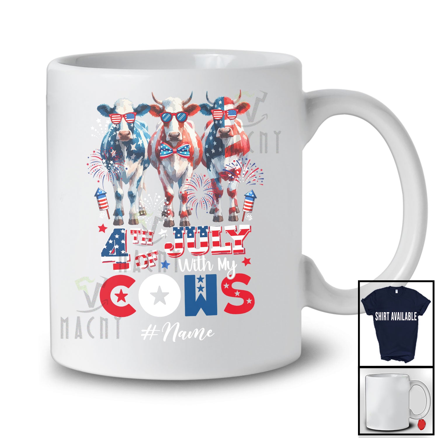 Personalized 4th of July My With Cows; Proud Custom Name Farmer Three Cows; Patriotic T-Shirt. This cotton t-shirt is a durable staple product with a classic fit. One of the most popular items, it has a relaxed style made for everyday and casual wear.