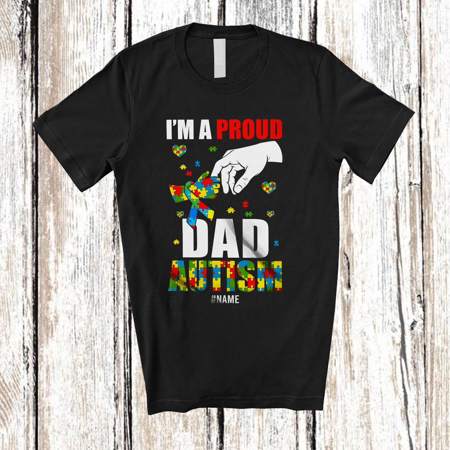 Personalized A Proud Dad Autism; Lovely Father's Day Puzzle Heart; Custom Name Boys Family T-Shirt. This cotton t-shirt is a durable staple product with a classic fit. One of the most popular items, it has a relaxed style made for everyday and casual wear.