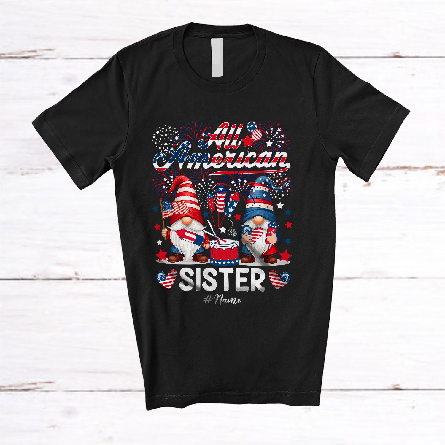 Personalized All American Sister; Proud 4th Of July US Flag Fireworks; Custom Name Patriotic T-Shirt. This cotton t-shirt is a durable staple product with a classic fit. One of the most popular items, it has a relaxed style made for everyday and casual wear.