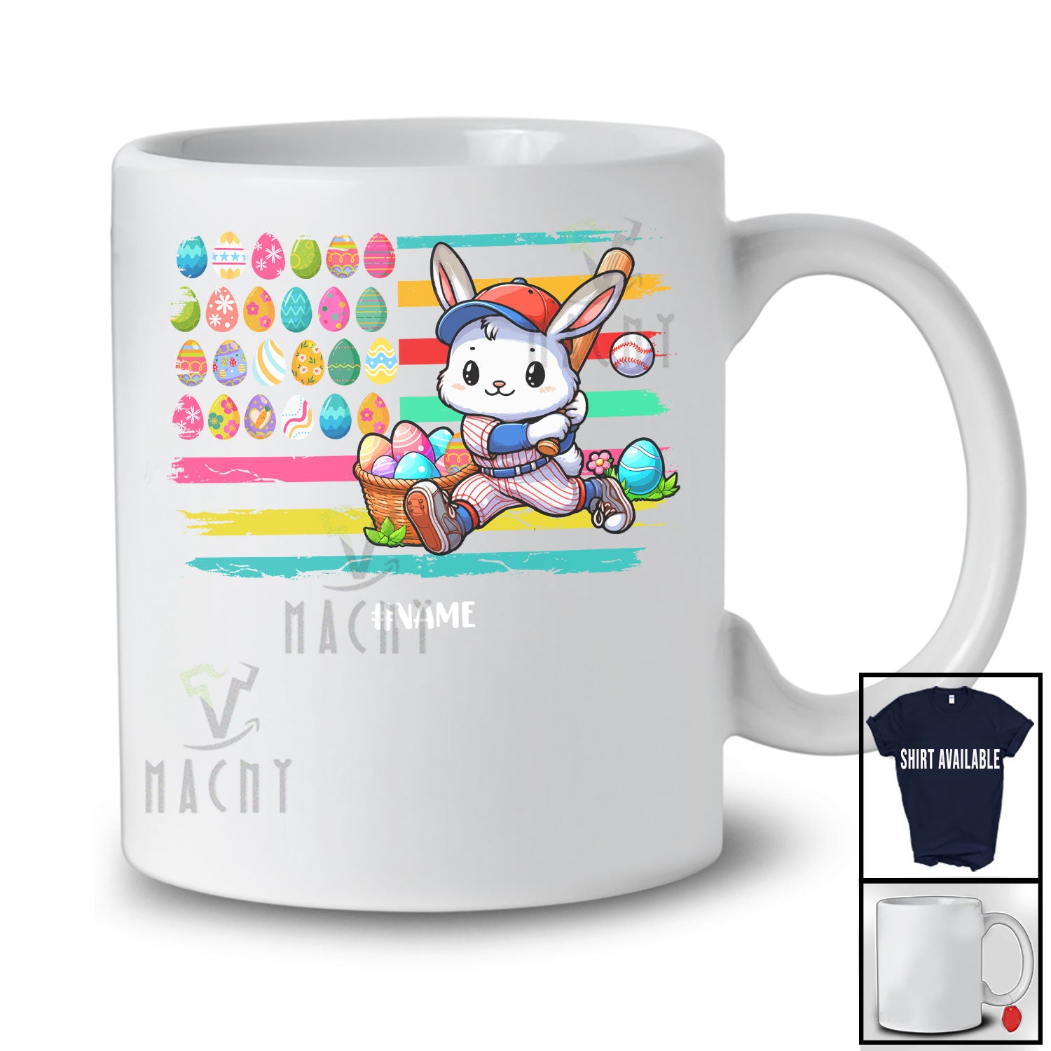 Personalized American Flag Bunny Playing Baseball; Lovely Easter Eggs Custom Name Sport Player T-Shirt. This cotton t-shirt is a durable staple product with a classic fit. One of the most popular items, it has a relaxed style made for everyday and casual wear.